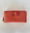 Crafted from smooth pink leather and finished with a fuchsia grosgrain bow adorned with the iconic gold-tone interlocking GG logo, this Gucci wallet blends playful charm with timeless elegance. The zip-around design adds both security and practicality for everyday use.