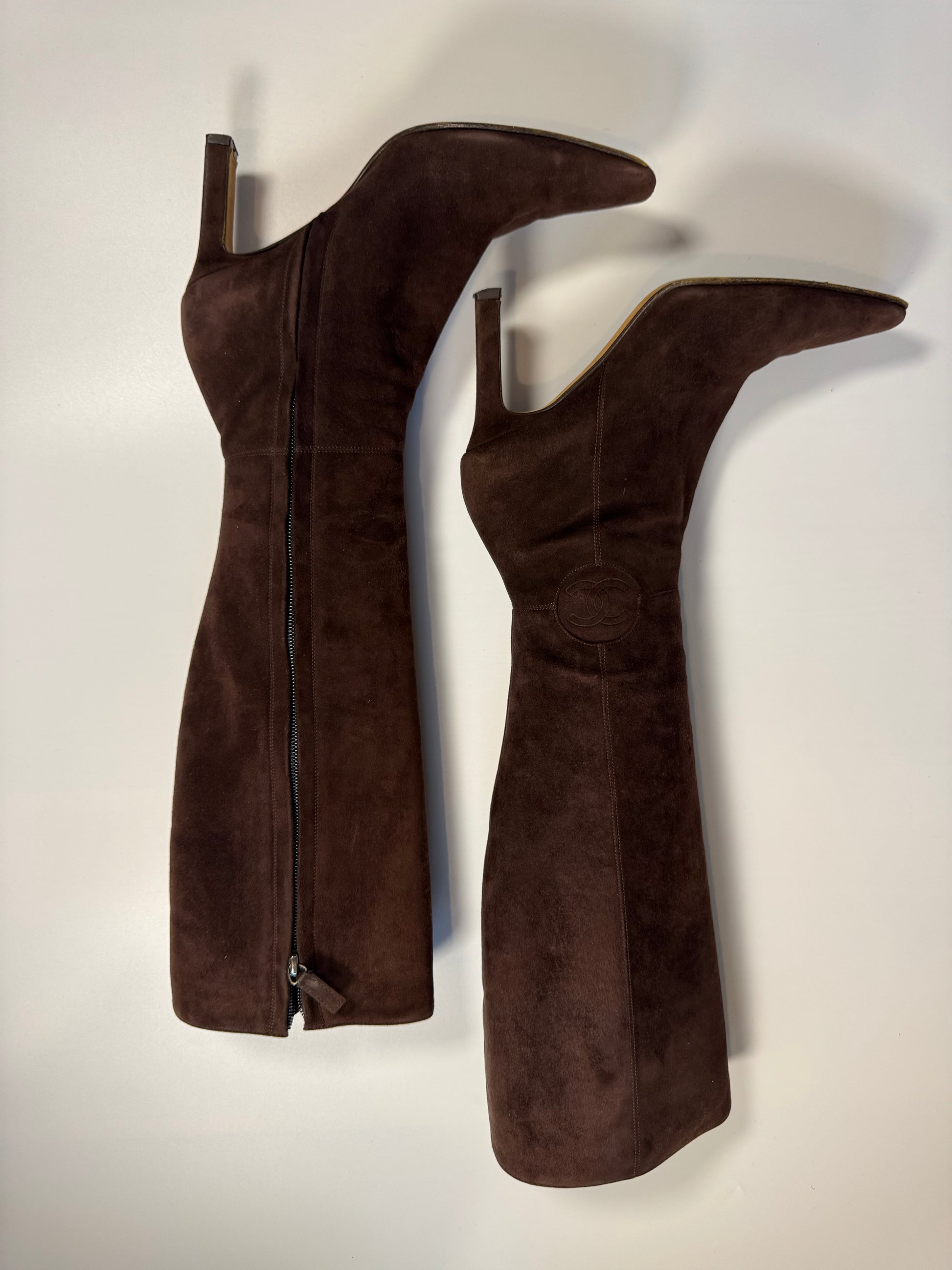 Elegant vintage Chanel knee-high boots crafted from rich brown suede leather, featuring a sleek, softly structured silhouette and a slim high heel. The design is finished with a subtle embossed Chanel logo at the calf and a discreet side zip, creating a refined yet timeless look that pairs beautifully with both dresses and tailored pieces.