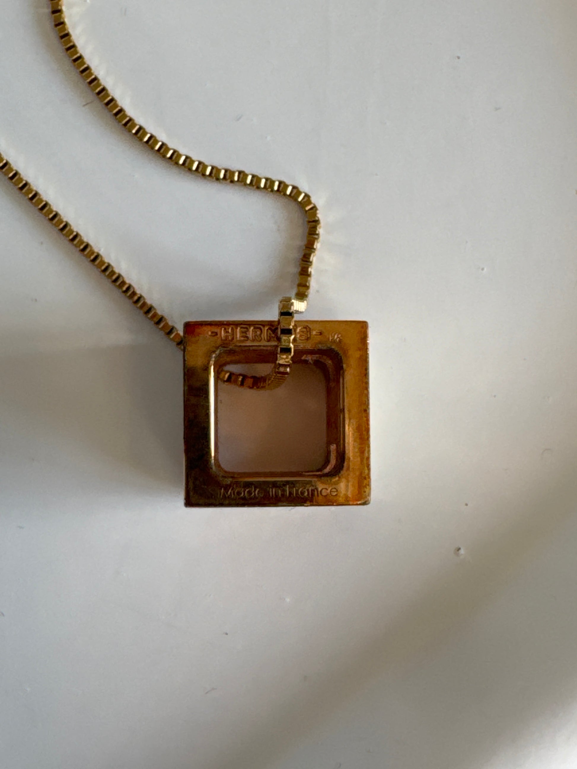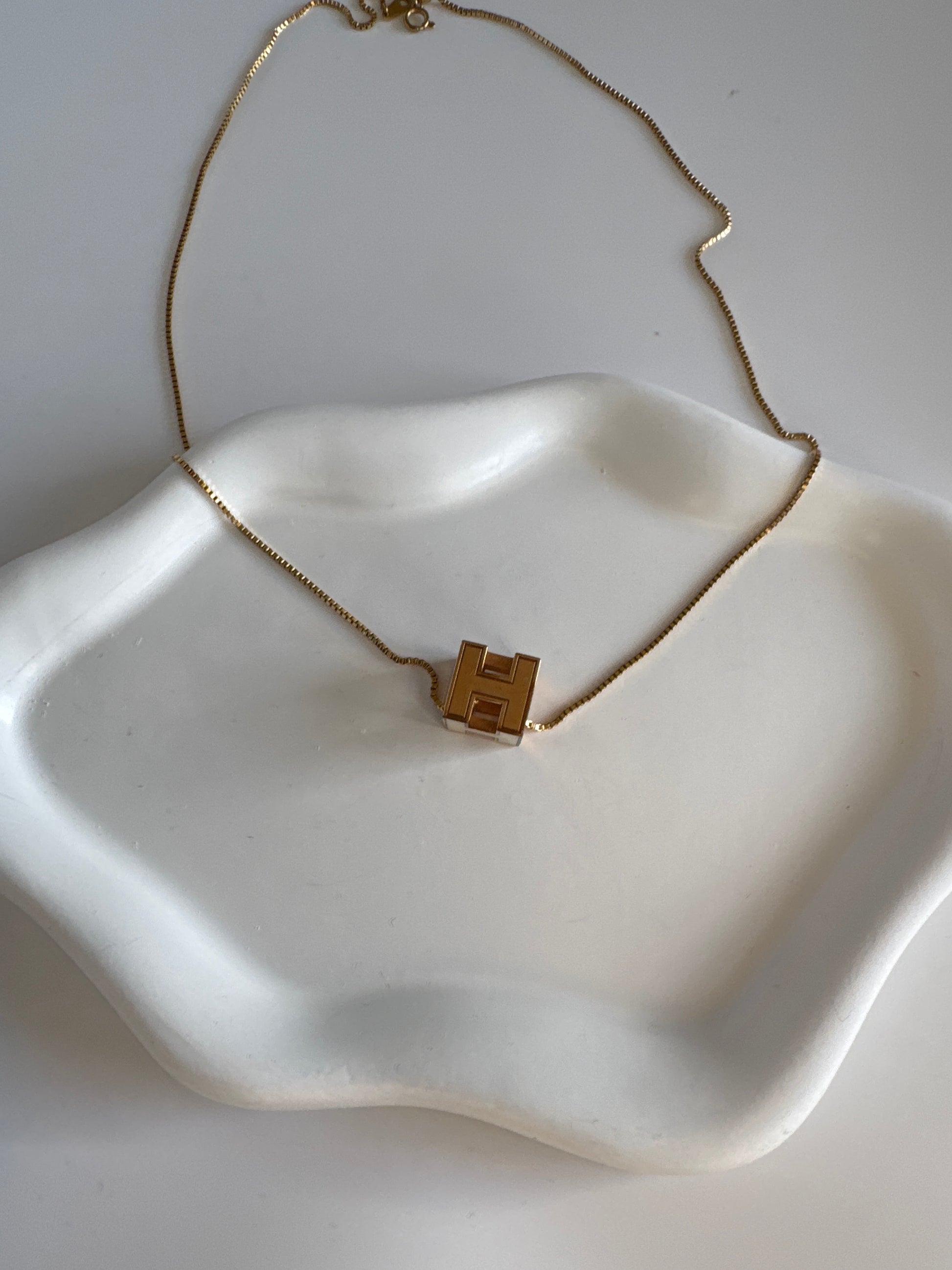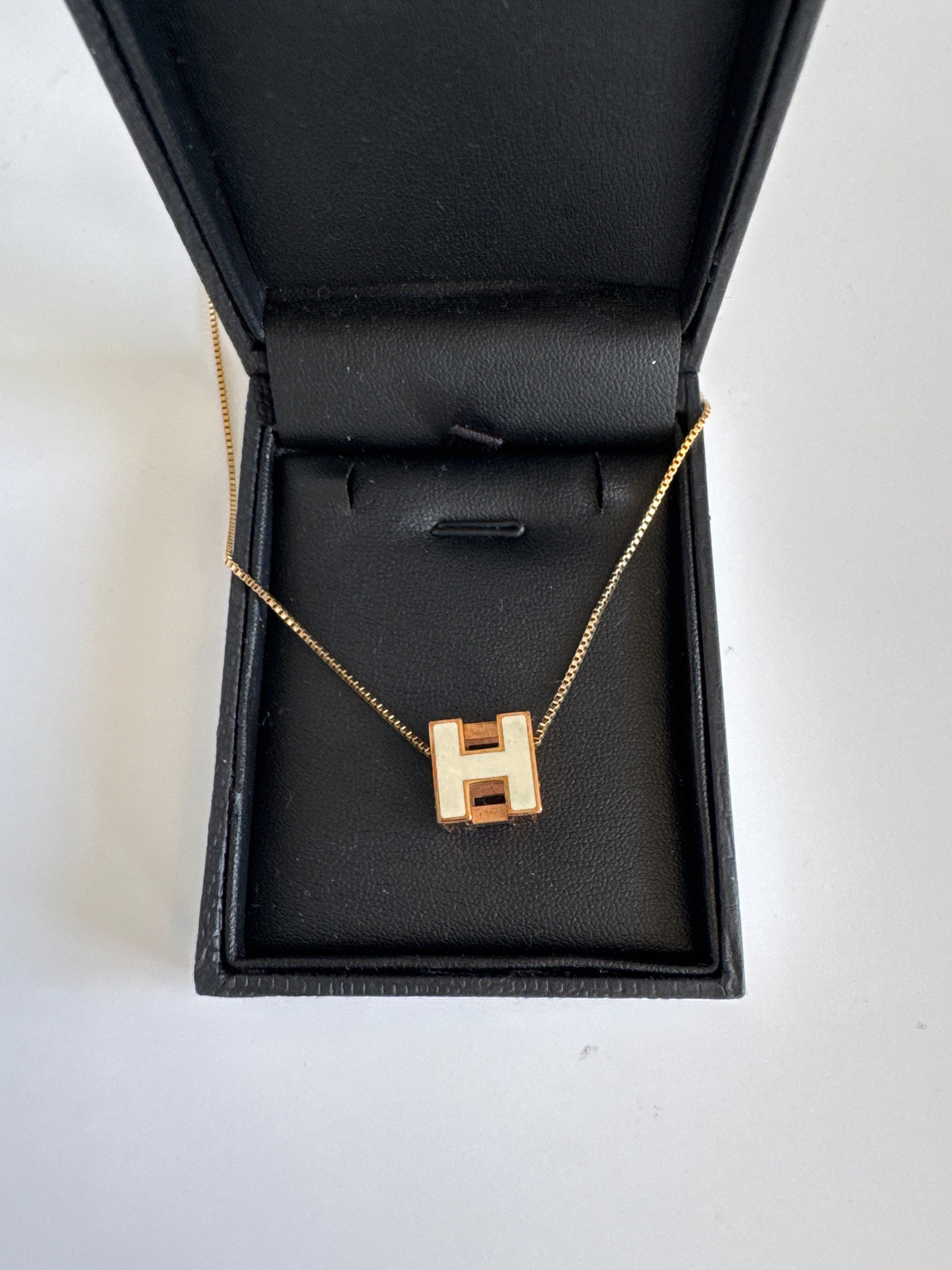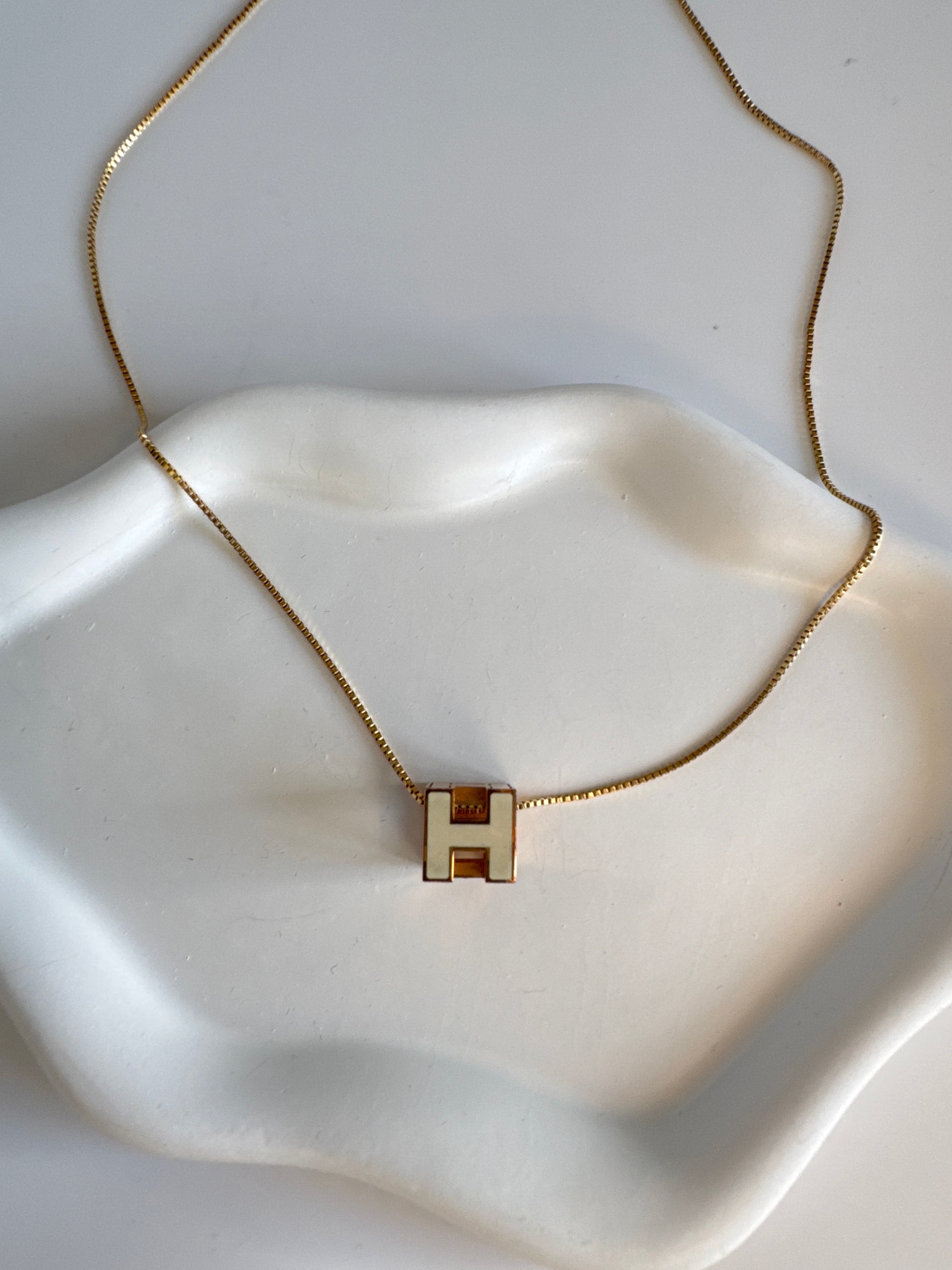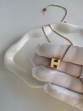 Iconic 3D “H” pendant in cream enamel framed in gold tone, suspended from a slim gold chain — bold yet minimal, instantly recognisable Hermès elegance. Perfect layered or solo.
