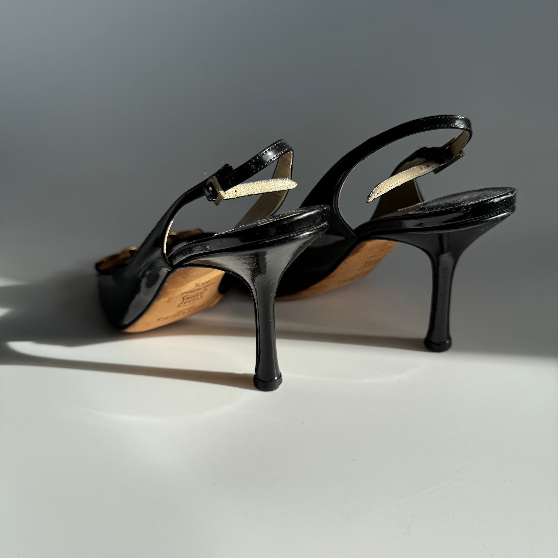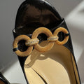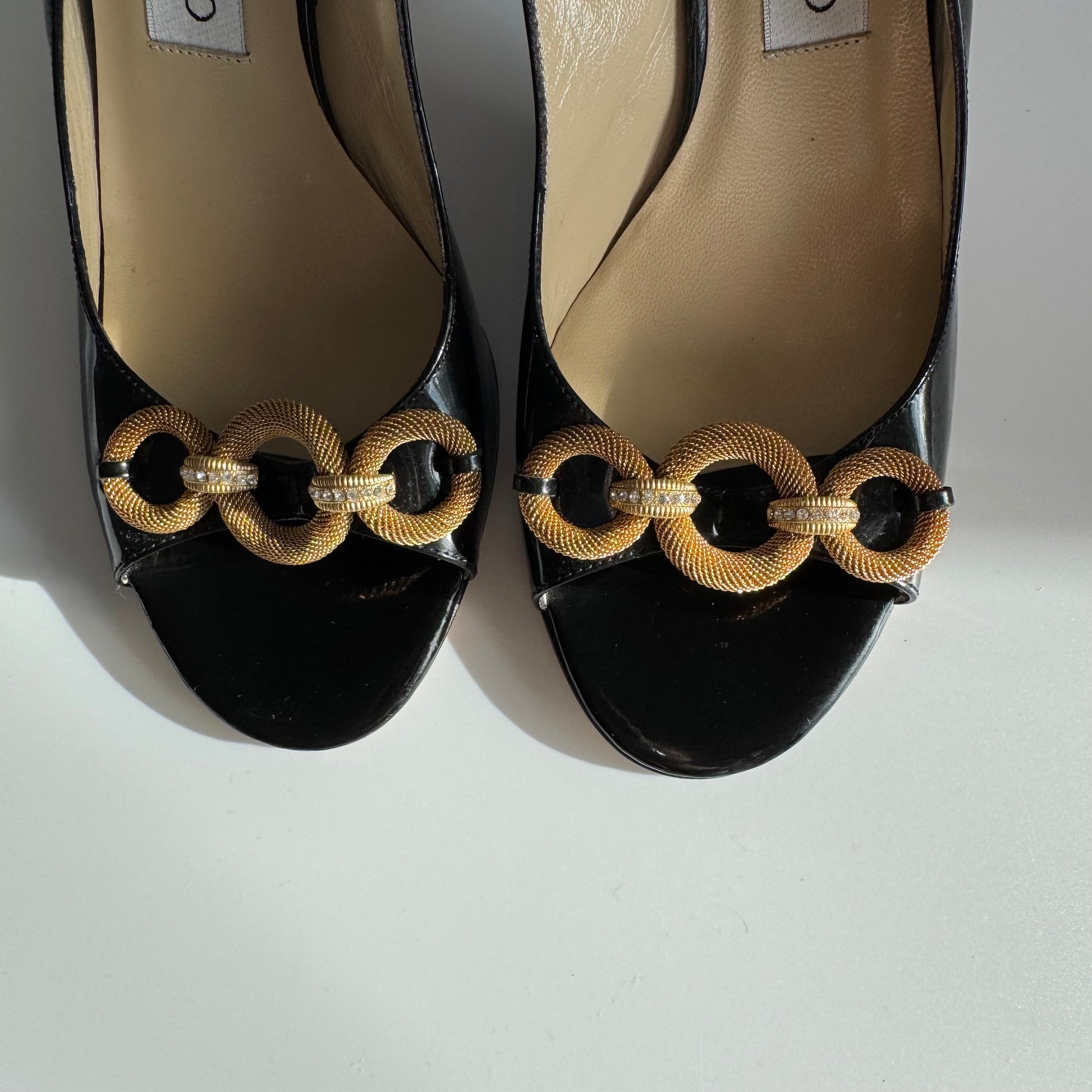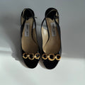 Jimmy Choo Black Patent Leather Slingback Heels with Gold Chain Detail