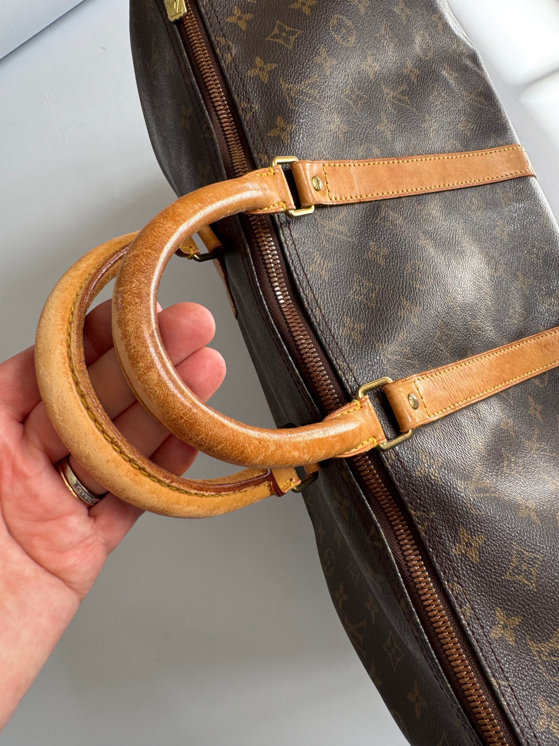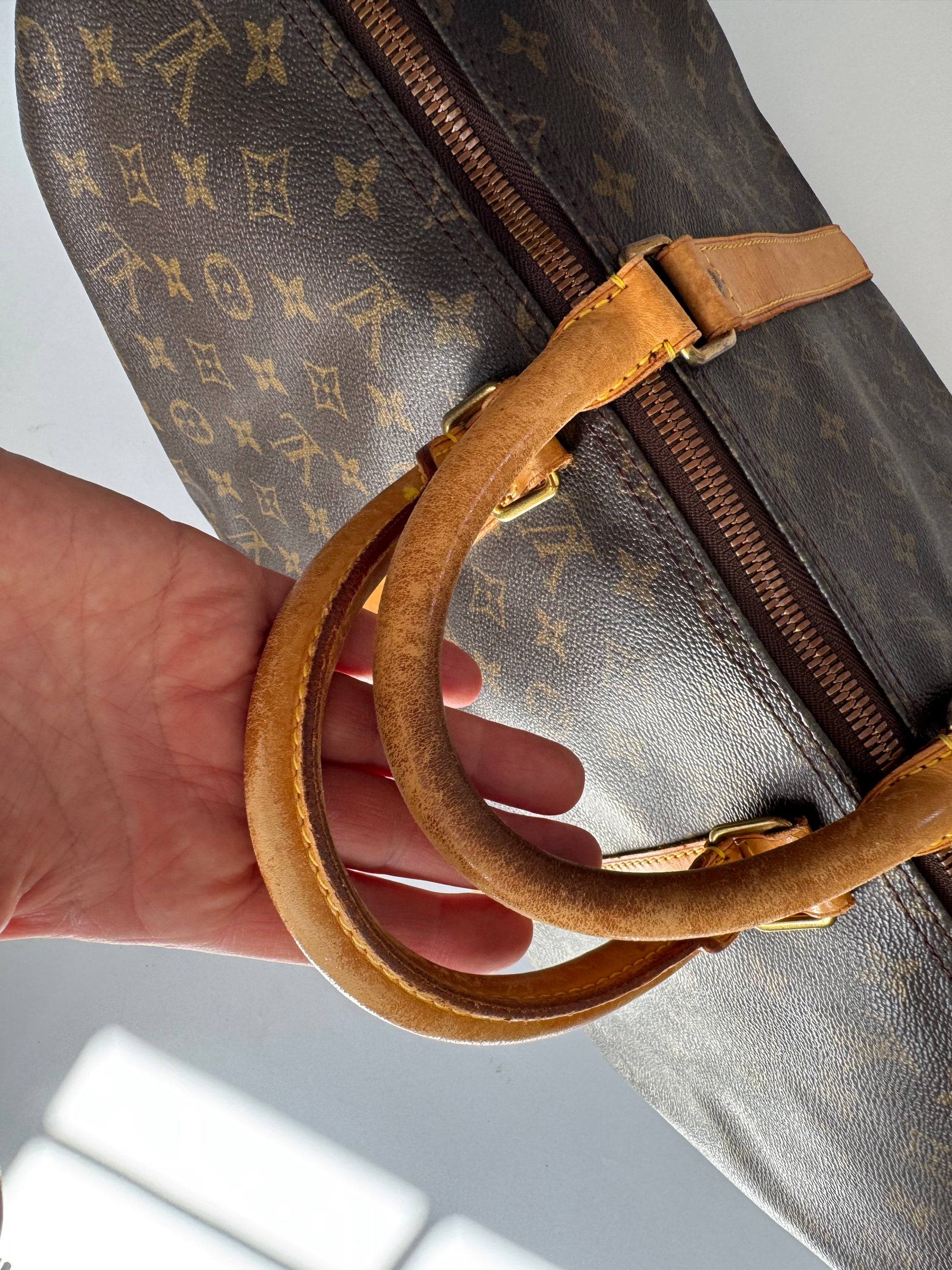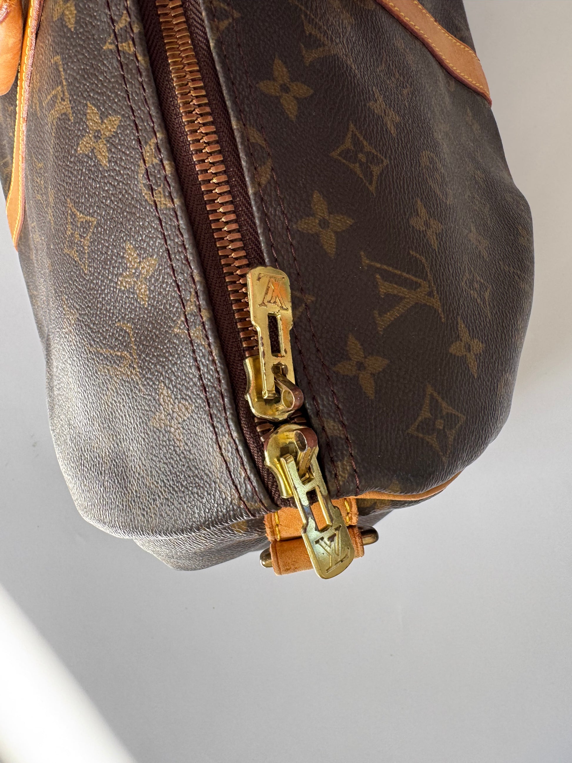 Details: Iconic Louis Vuitton travel bag crafted in classic monogram canvas with natural leather trim. Double zip closure and spacious interior — ideal for longer trips or weekend getaways.