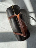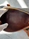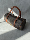 Iconic monogram coated canvas with natural vachetta trim and rolled handles in a warm honey patina. Sleek cylindrical silhouette with full zip — structured, functional, and endlessly wearable.