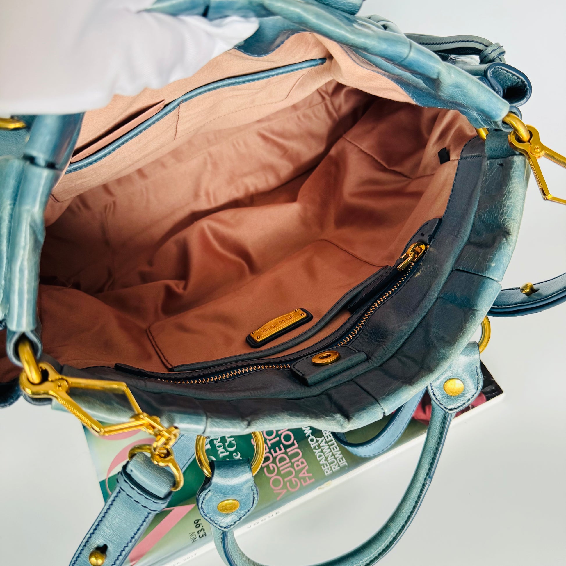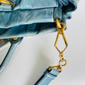 Crafted in soft blue Vitello leather with gold-tone hardware and gentle pleating. Elegant and versatile — perfect for everyday wear.