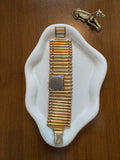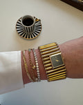 A bold, jewellery-style gold bracelet watch with a sleek black dial — chic, sculptural and beautifully vintage-inspired. A true statement piece that elevates any look.
