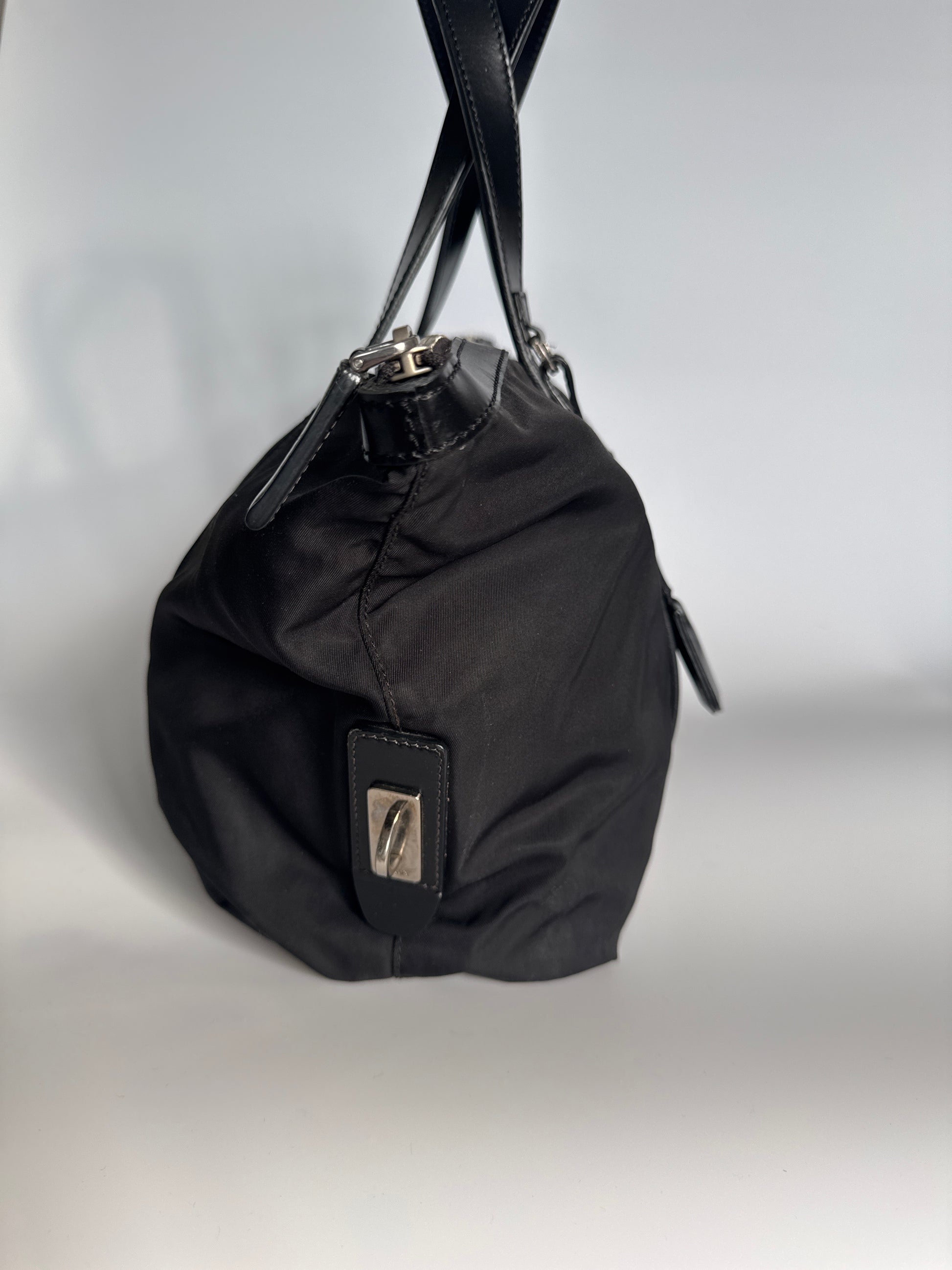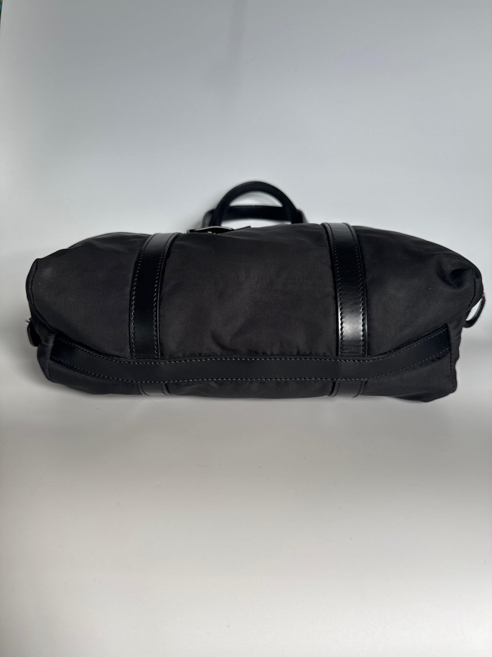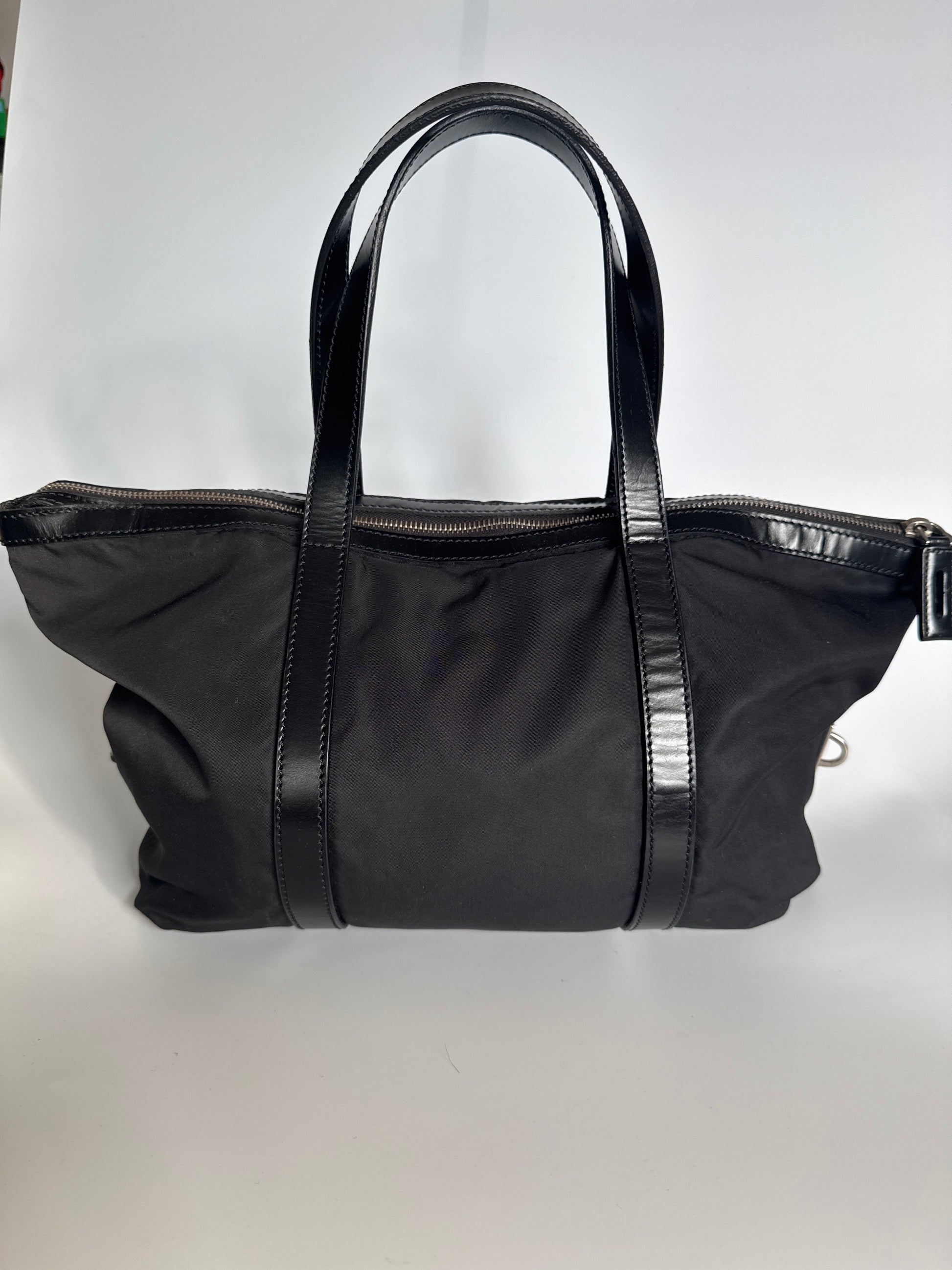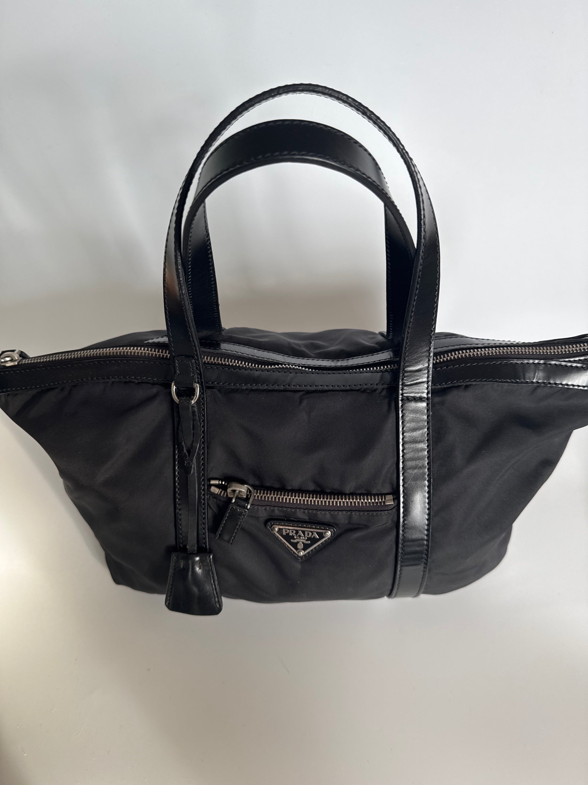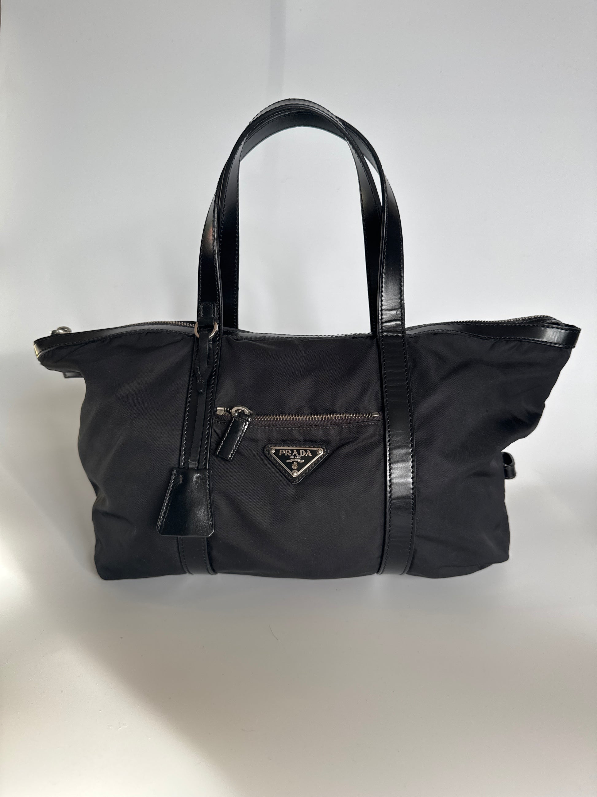 Black Tessuto nylon with sleek black leather trim and rolled handles, plus an exterior zip pocket topped with the enamel Prada triangle — functional, minimalist, unmistakably Prada.