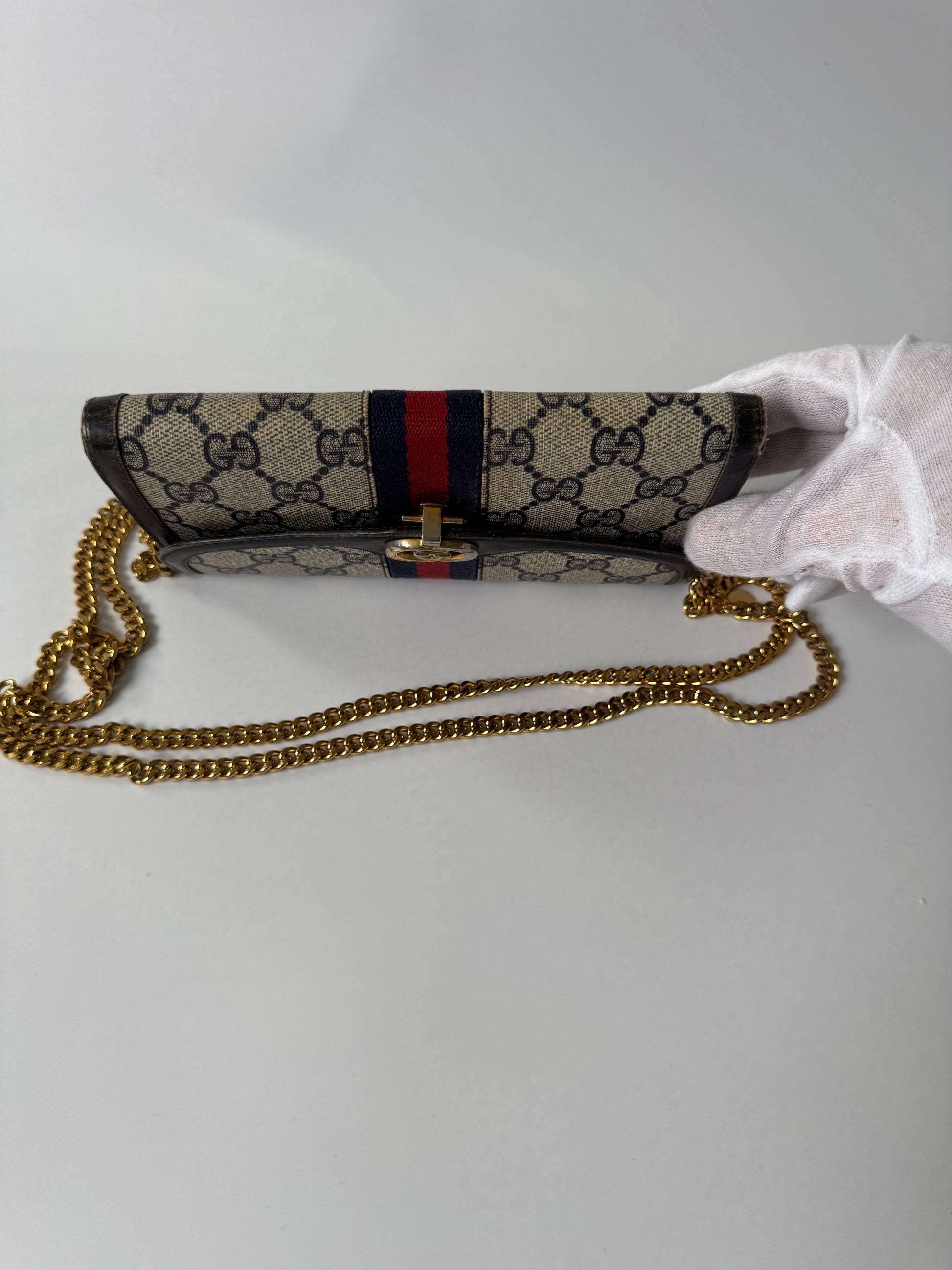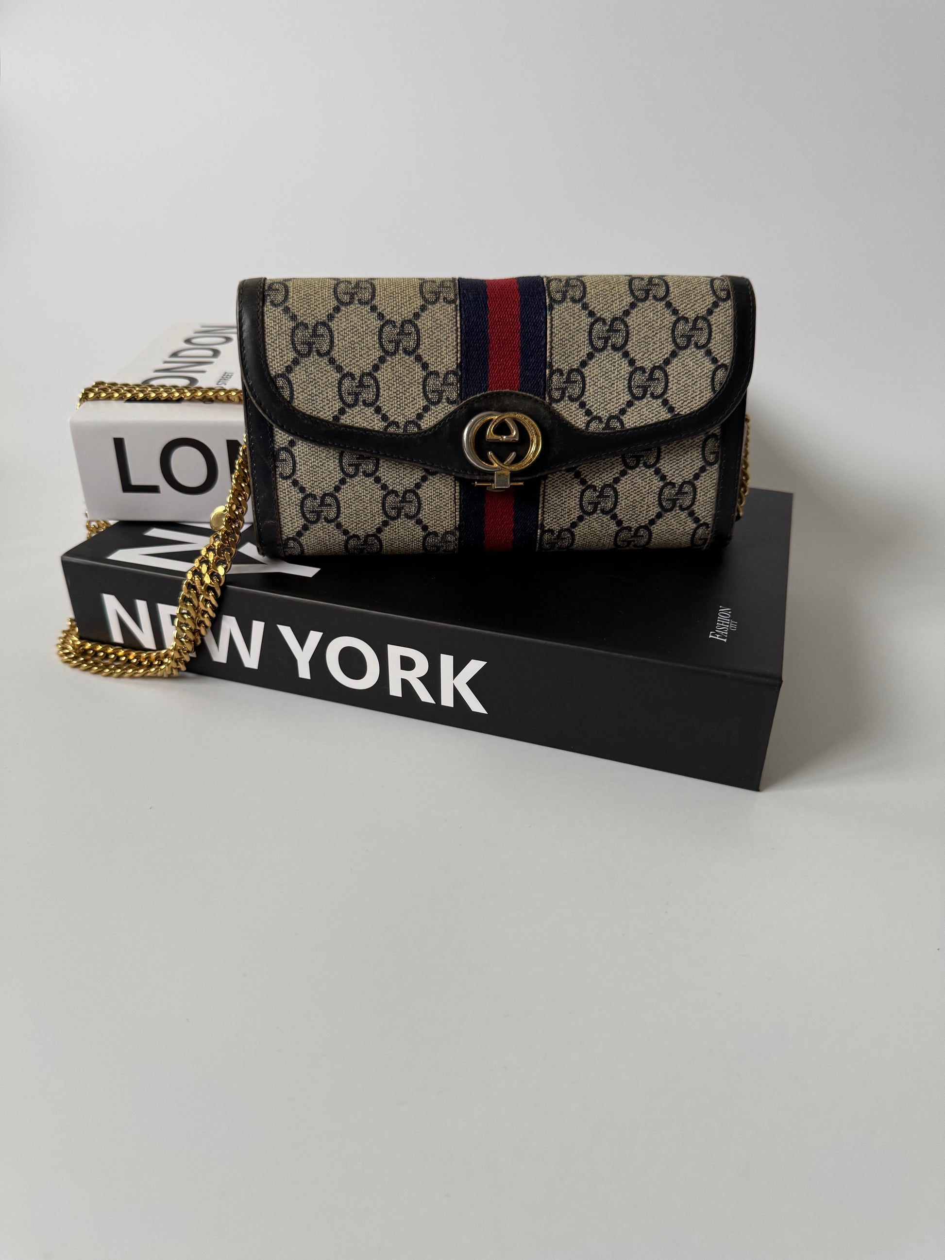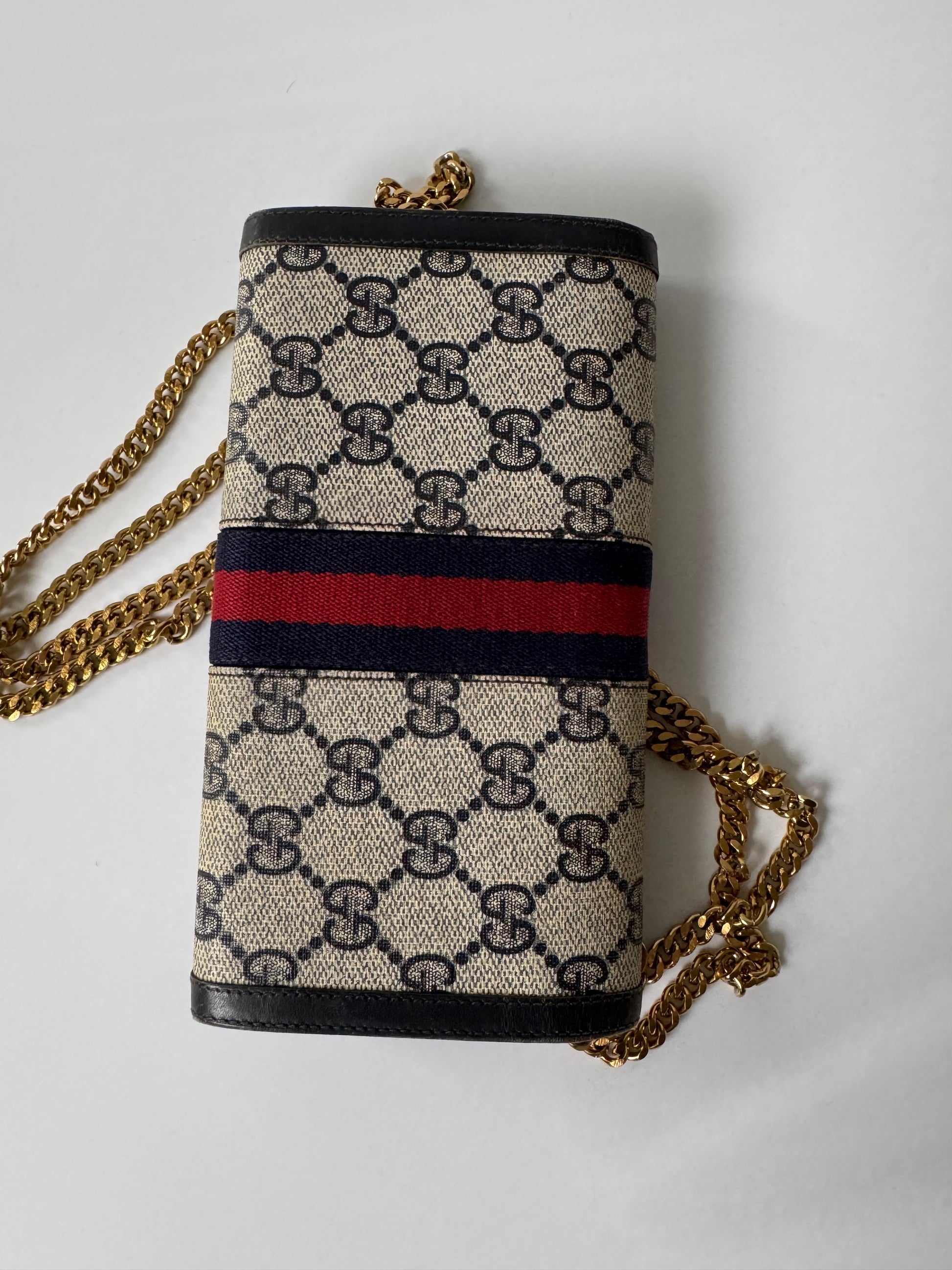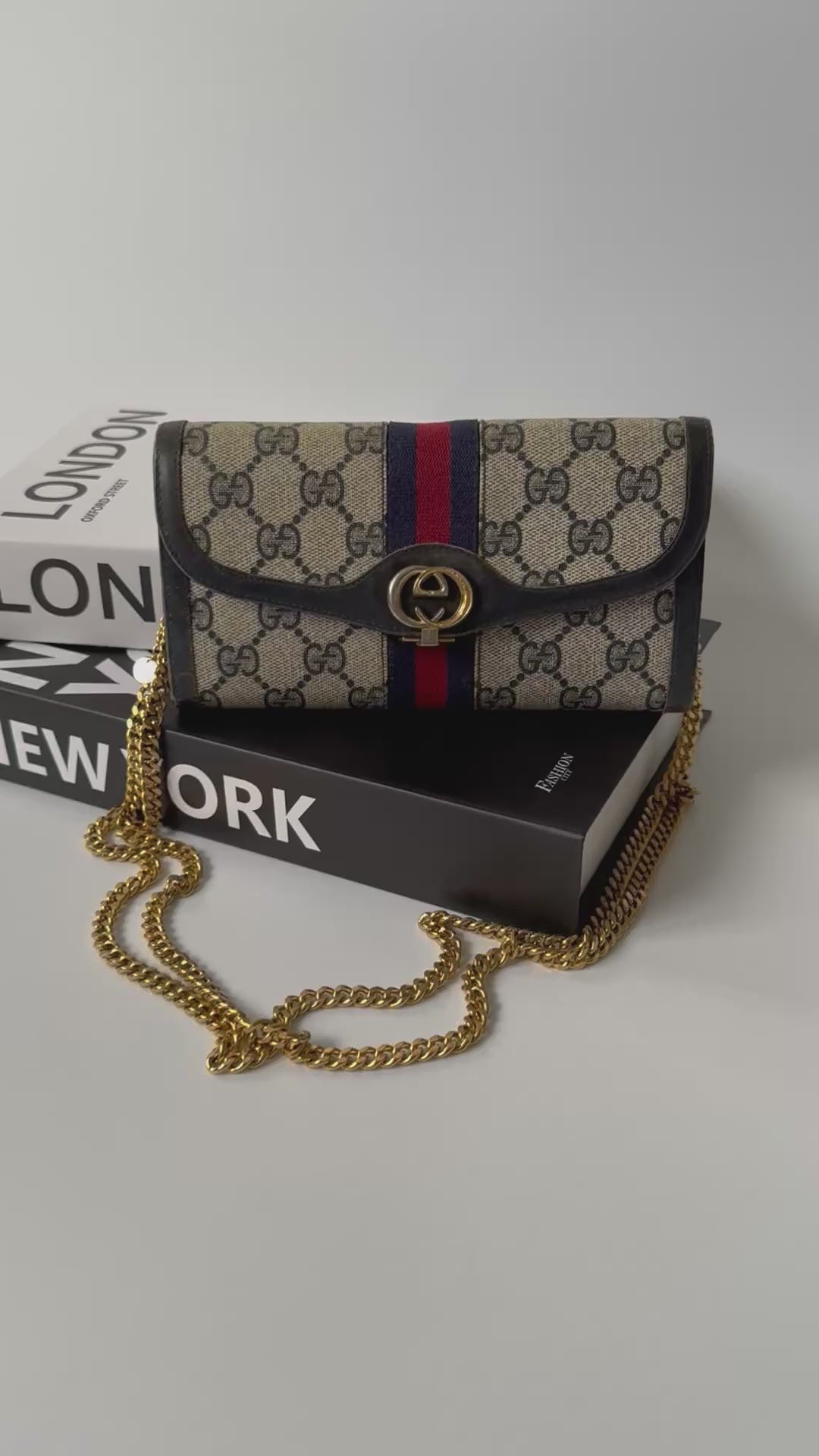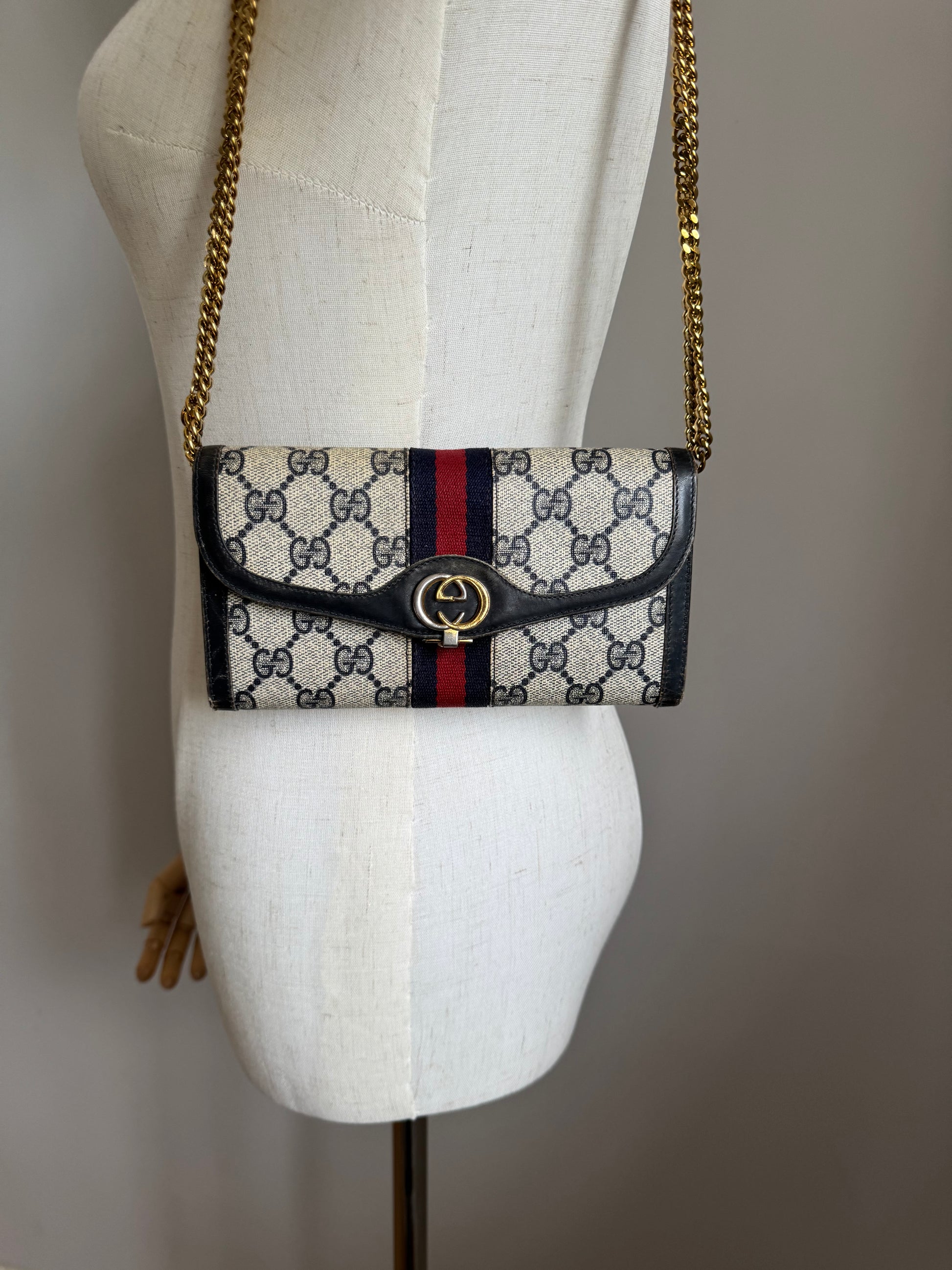 GG Supreme canvas with navy leather trim, finished with the red-navy web stripe and vintage gold-tone GG turn-lock. Detachable chain plus additional leather strap for versatile wear — compact, iconic, and collectible.