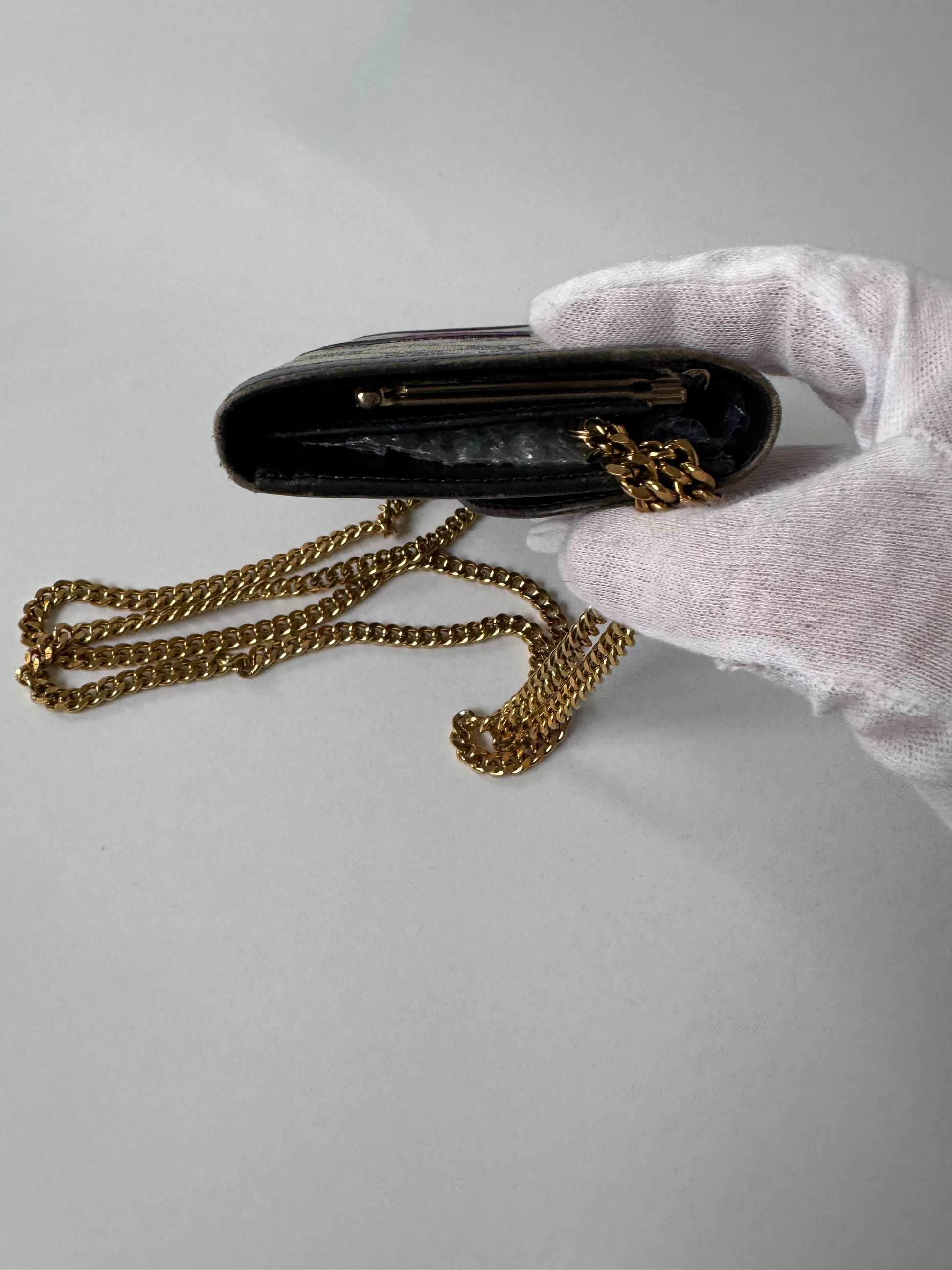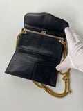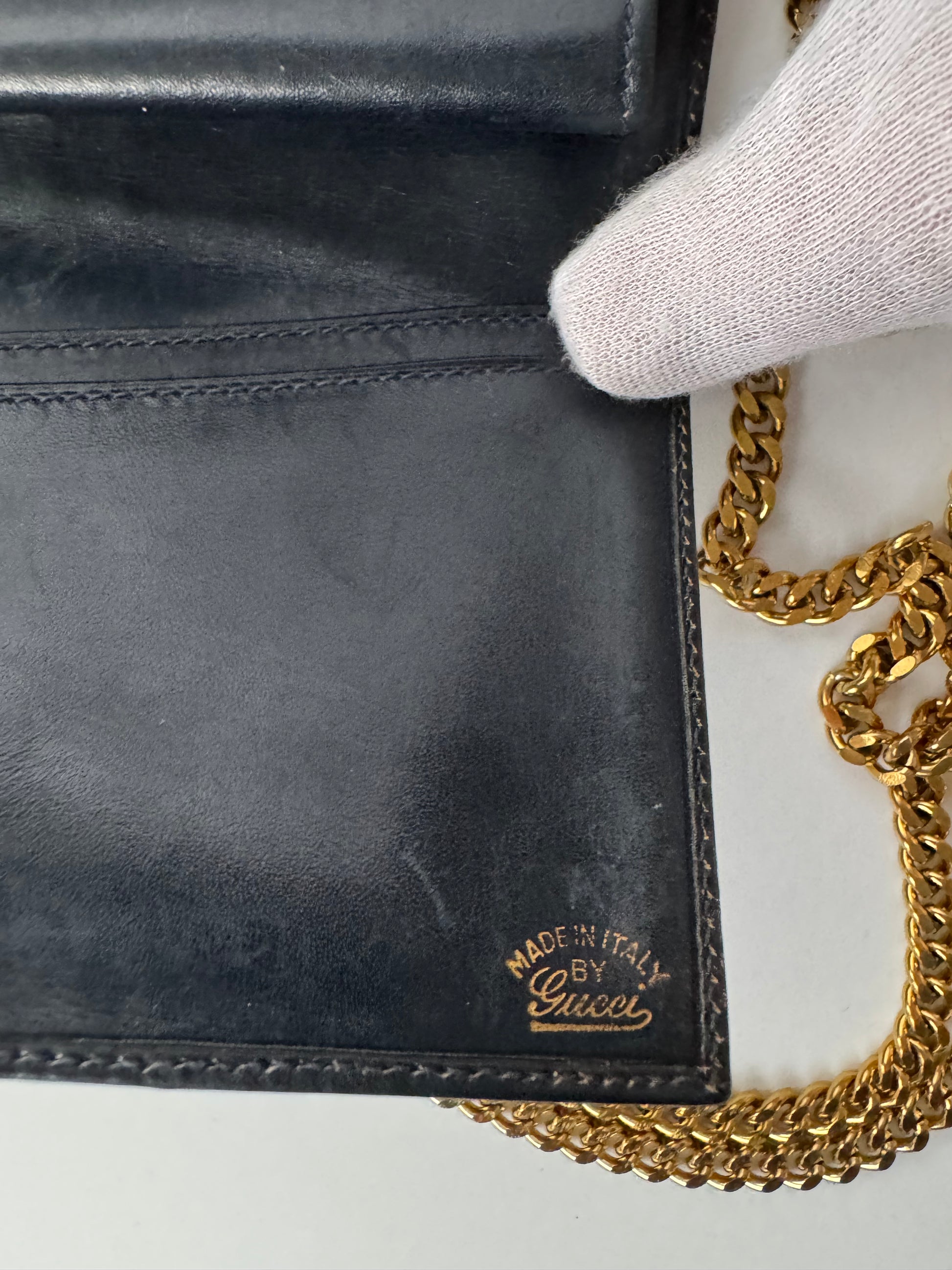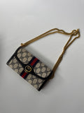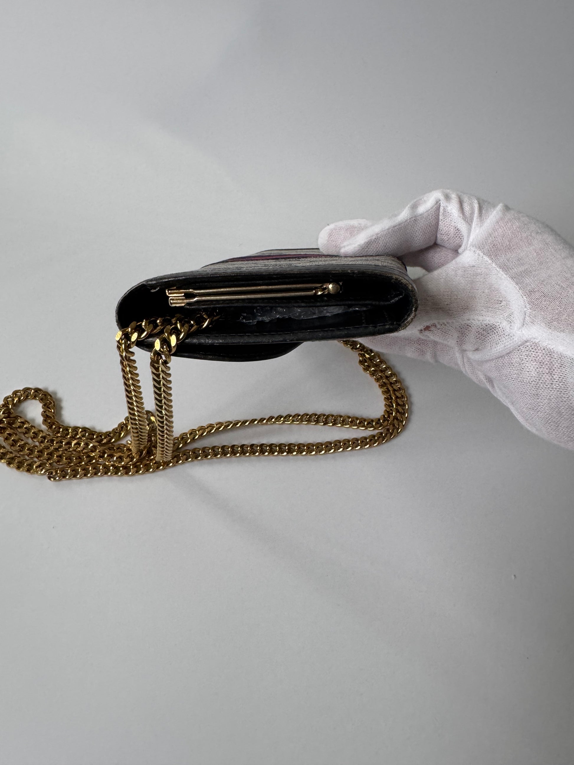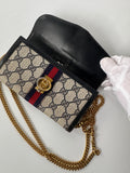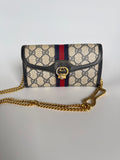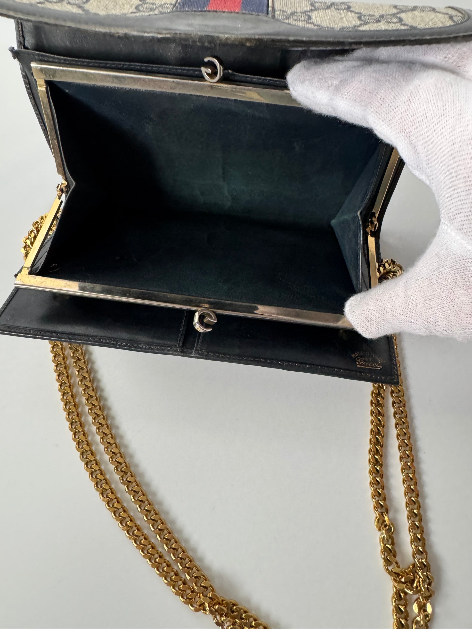 GG Supreme canvas with navy leather trim, finished with the red-navy web stripe and vintage gold-tone GG turn-lock. Detachable chain plus additional leather strap for versatile wear — compact, iconic, and collectible.