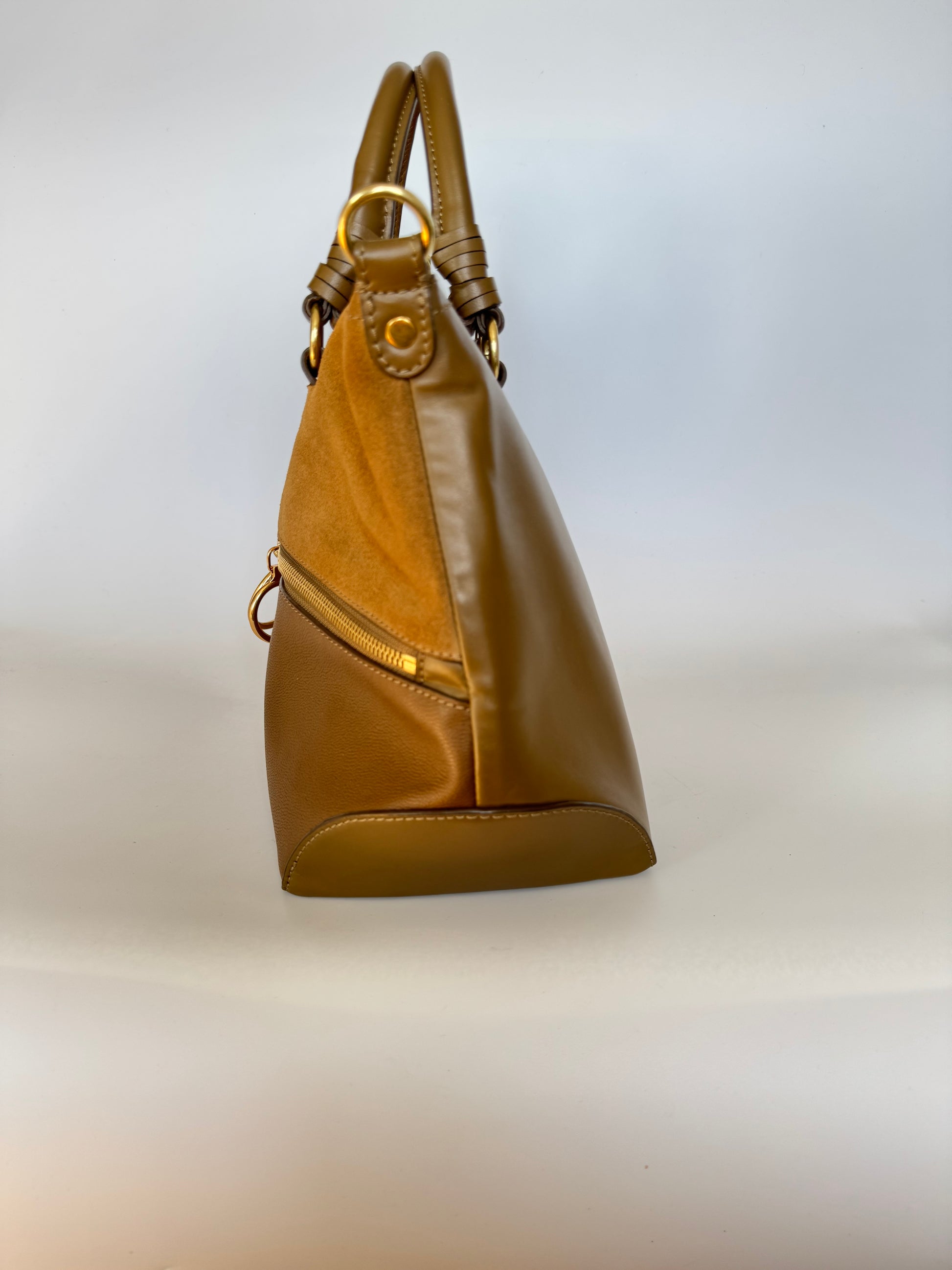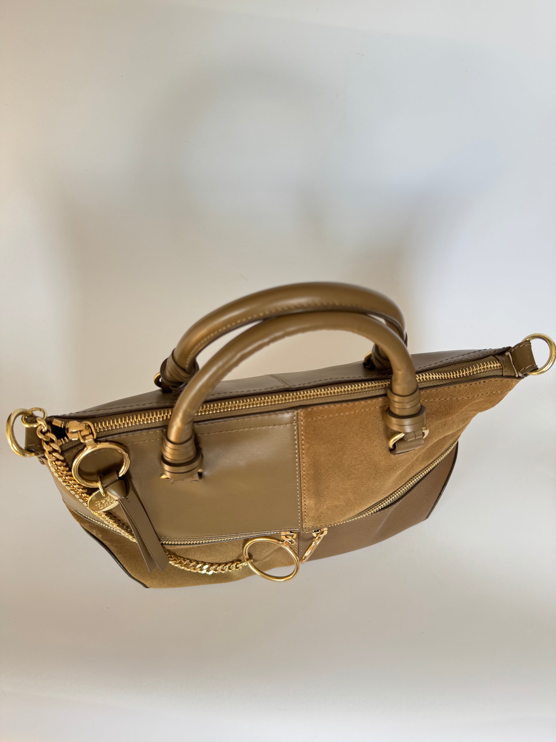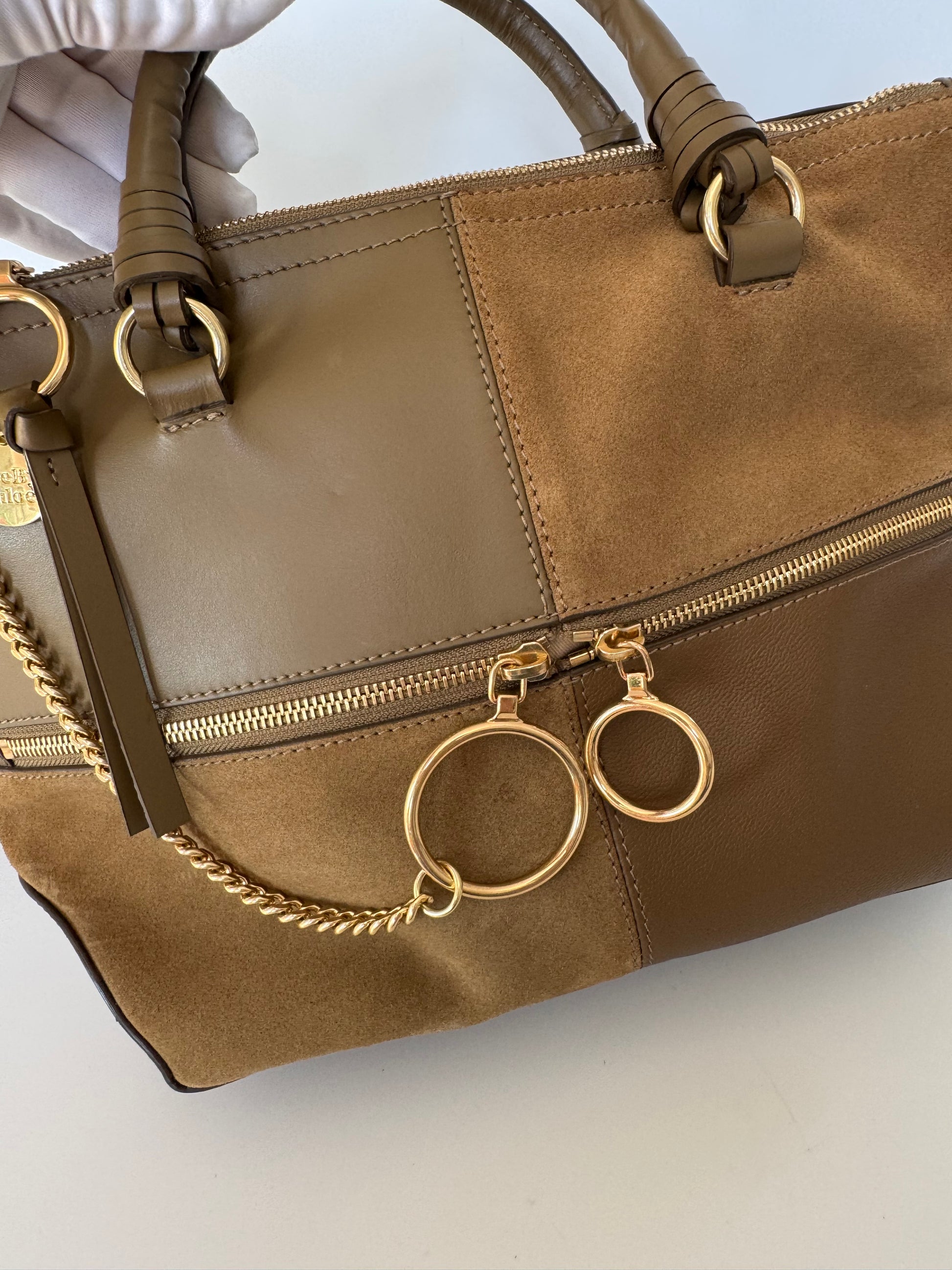 Details: Structured satchel in mixed leather and suede with signature ring hardware and front zip pocket. Comes with top handles and a detachable long strap.