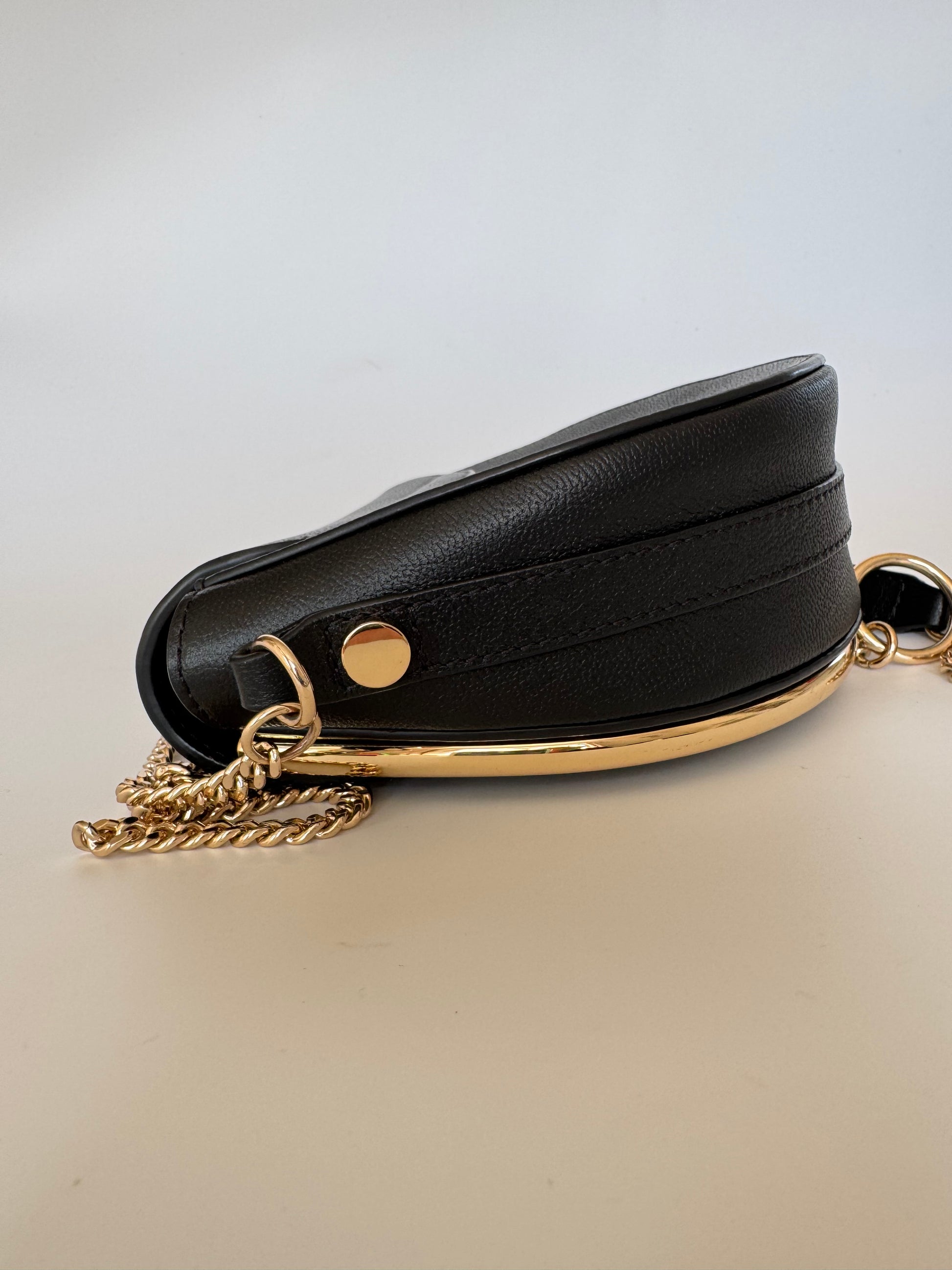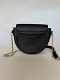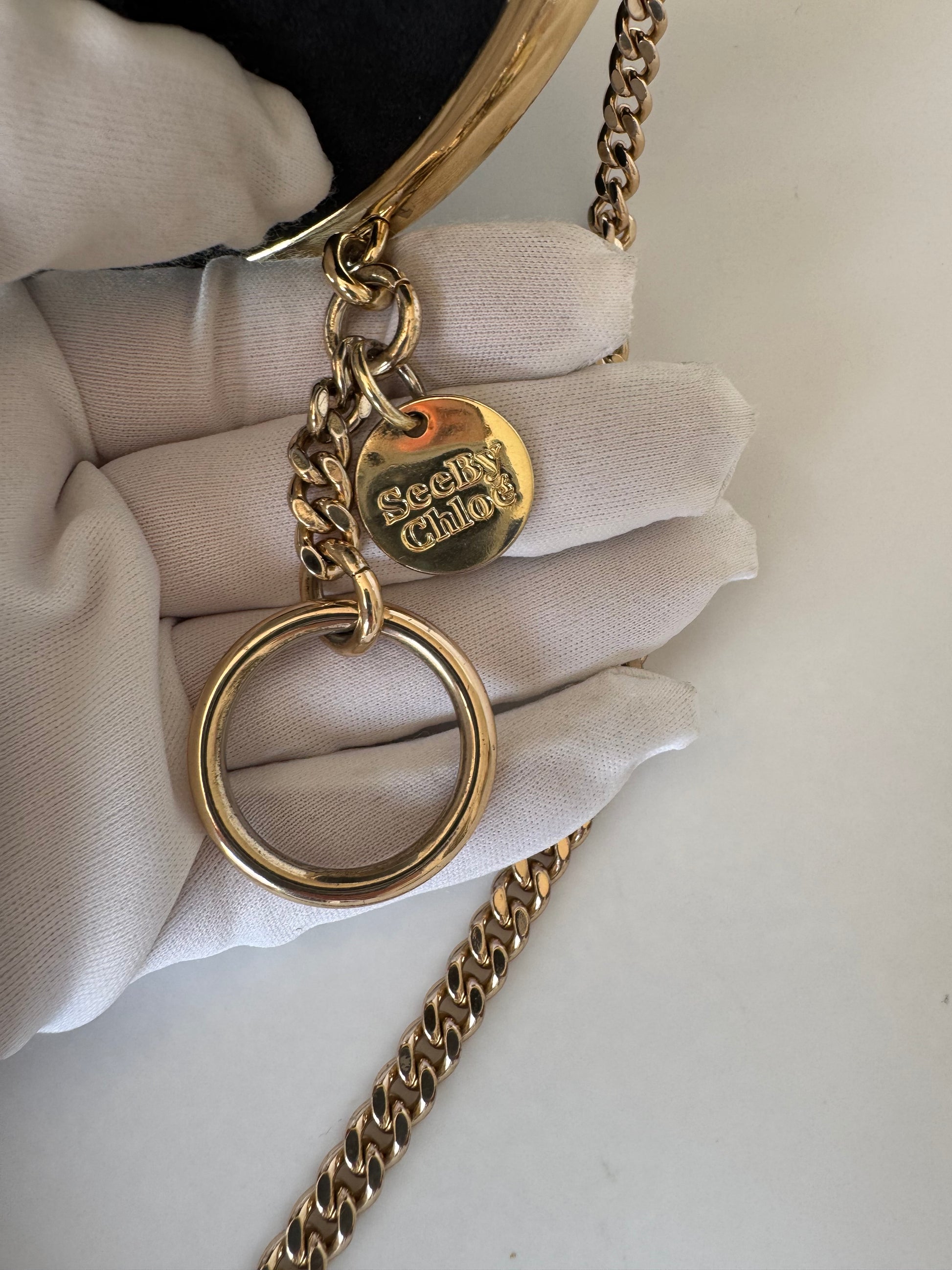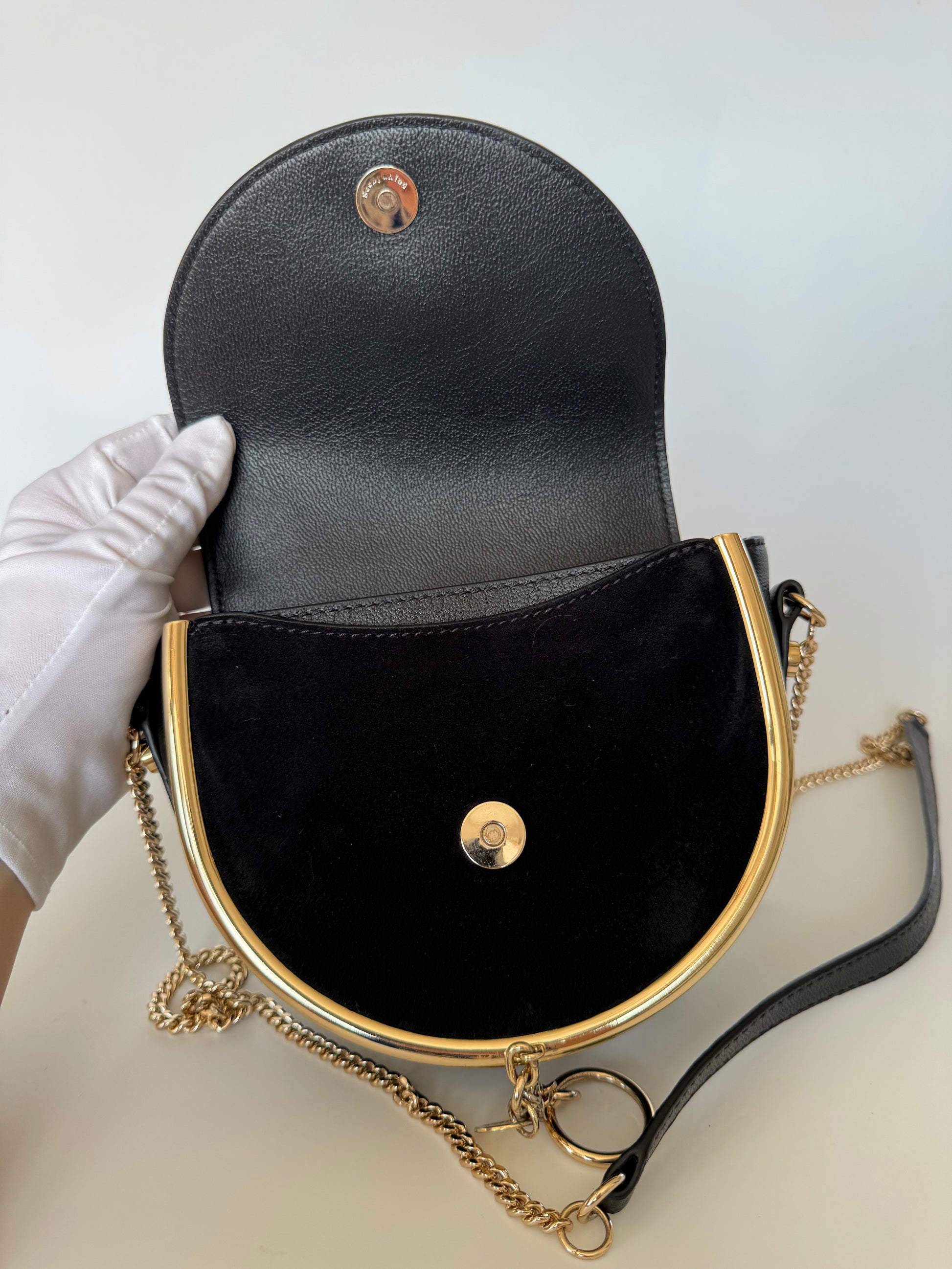 Details: Signature half-moon silhouette with gold-tone frame, chain strap and front ring charm. Flap closure.