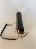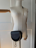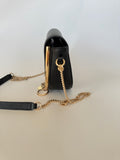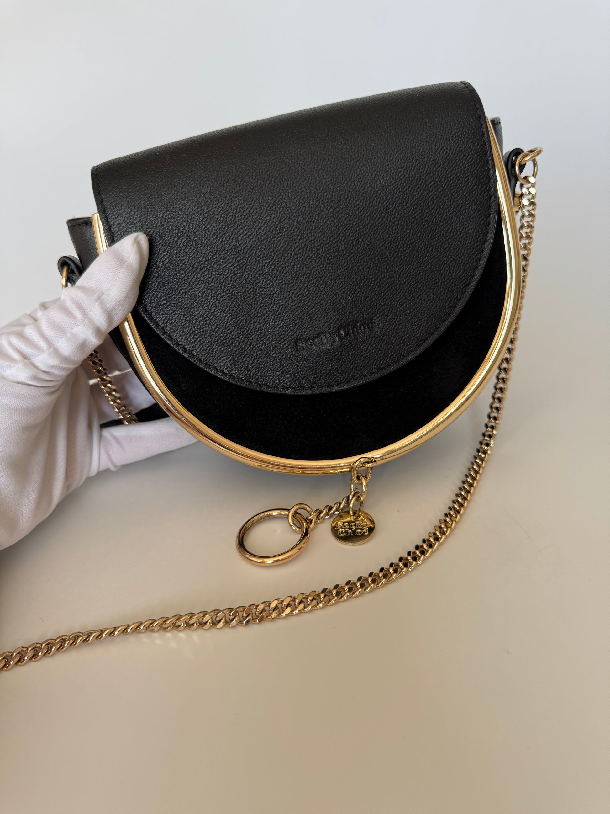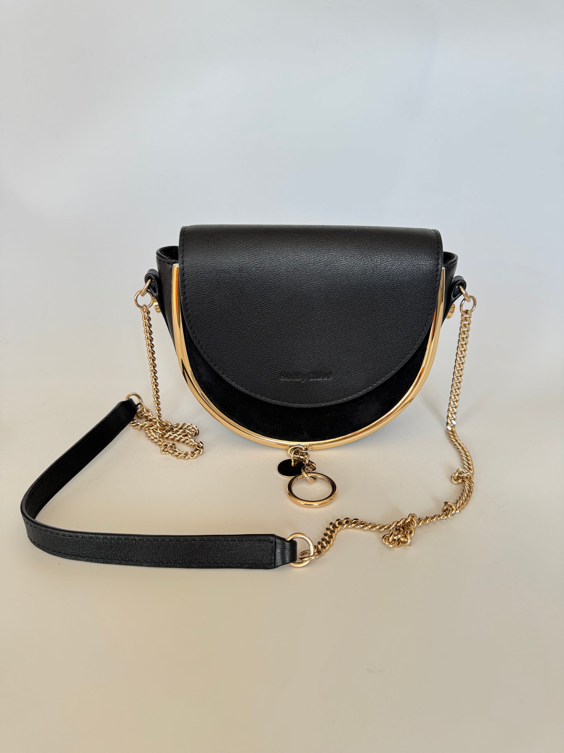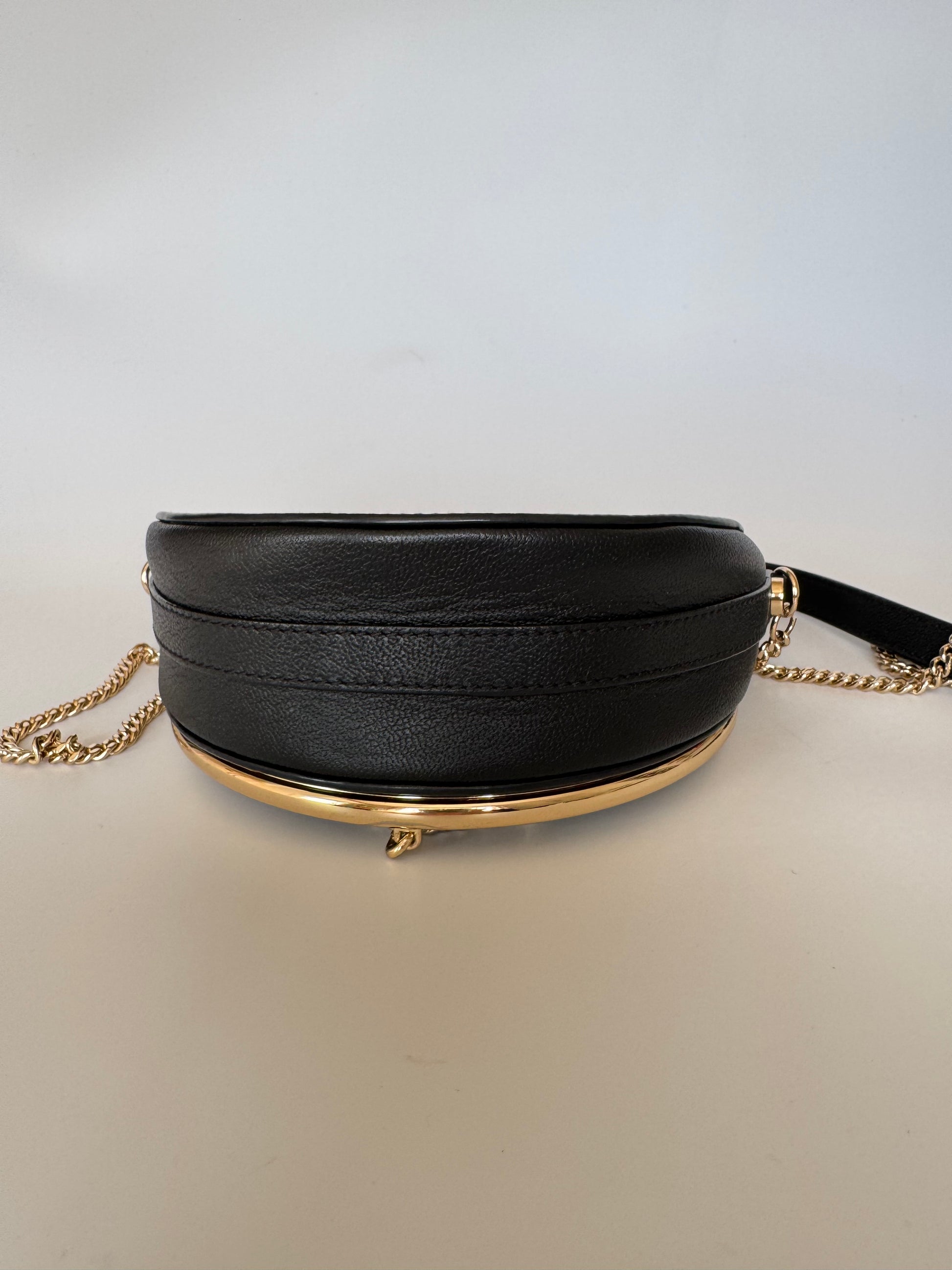 Details: Signature half-moon silhouette with gold-tone frame, chain strap and front ring charm. Flap closure.