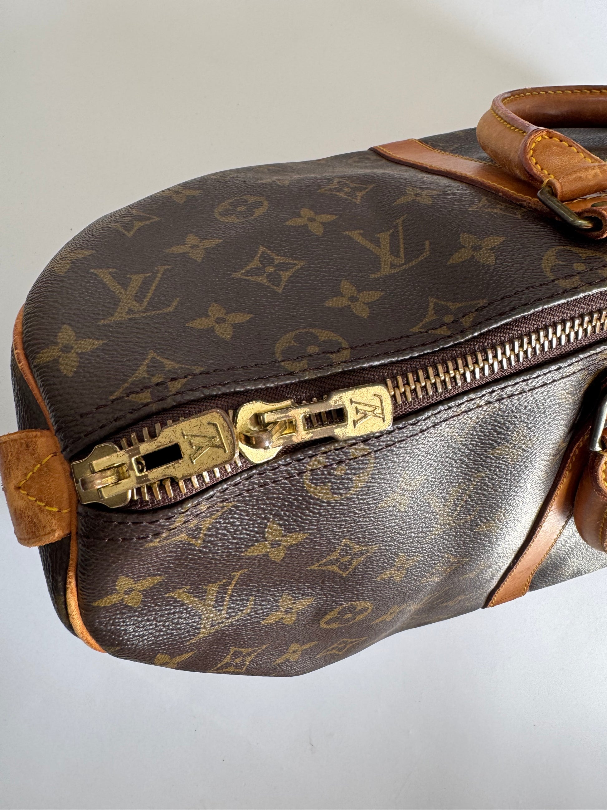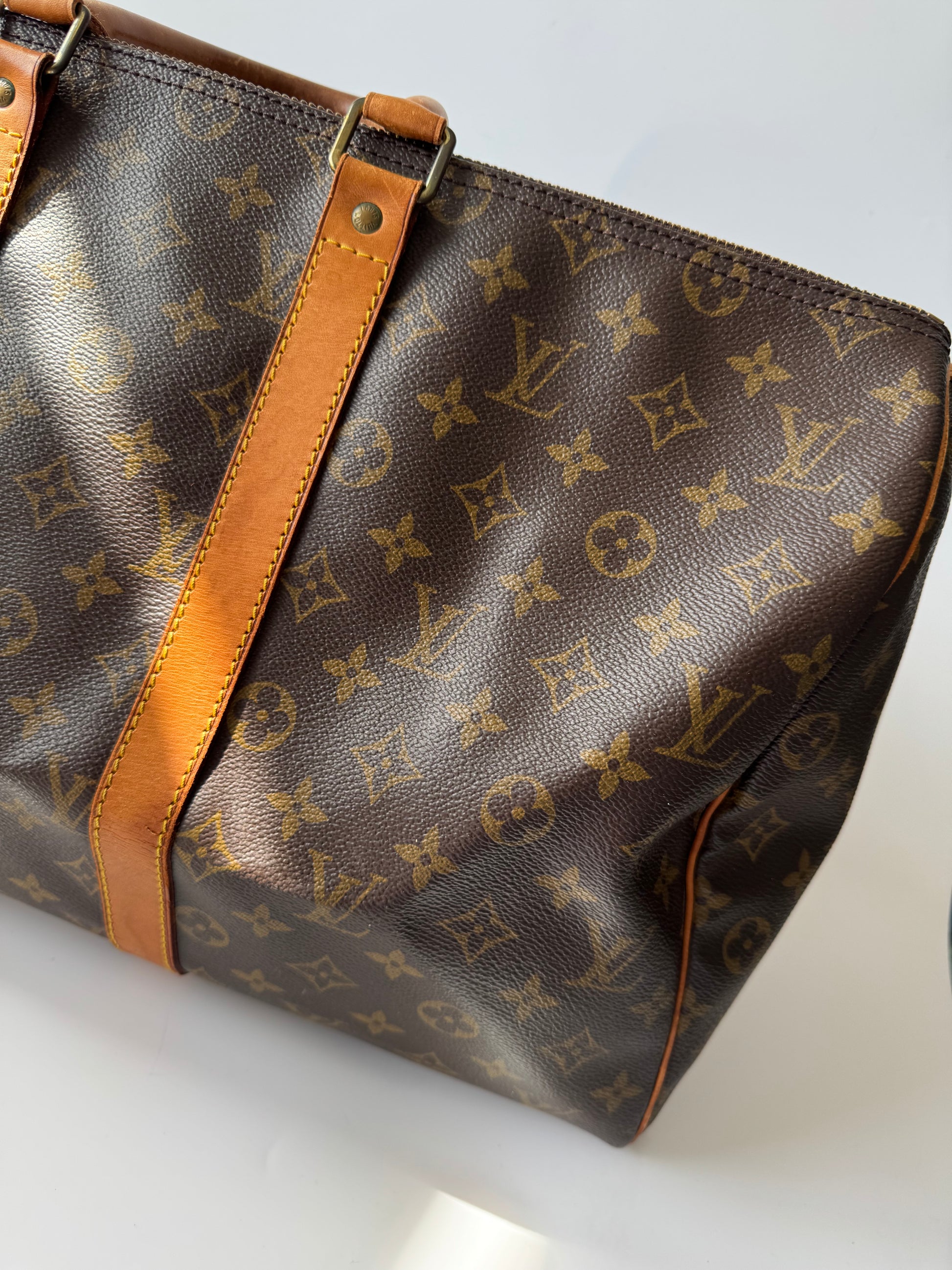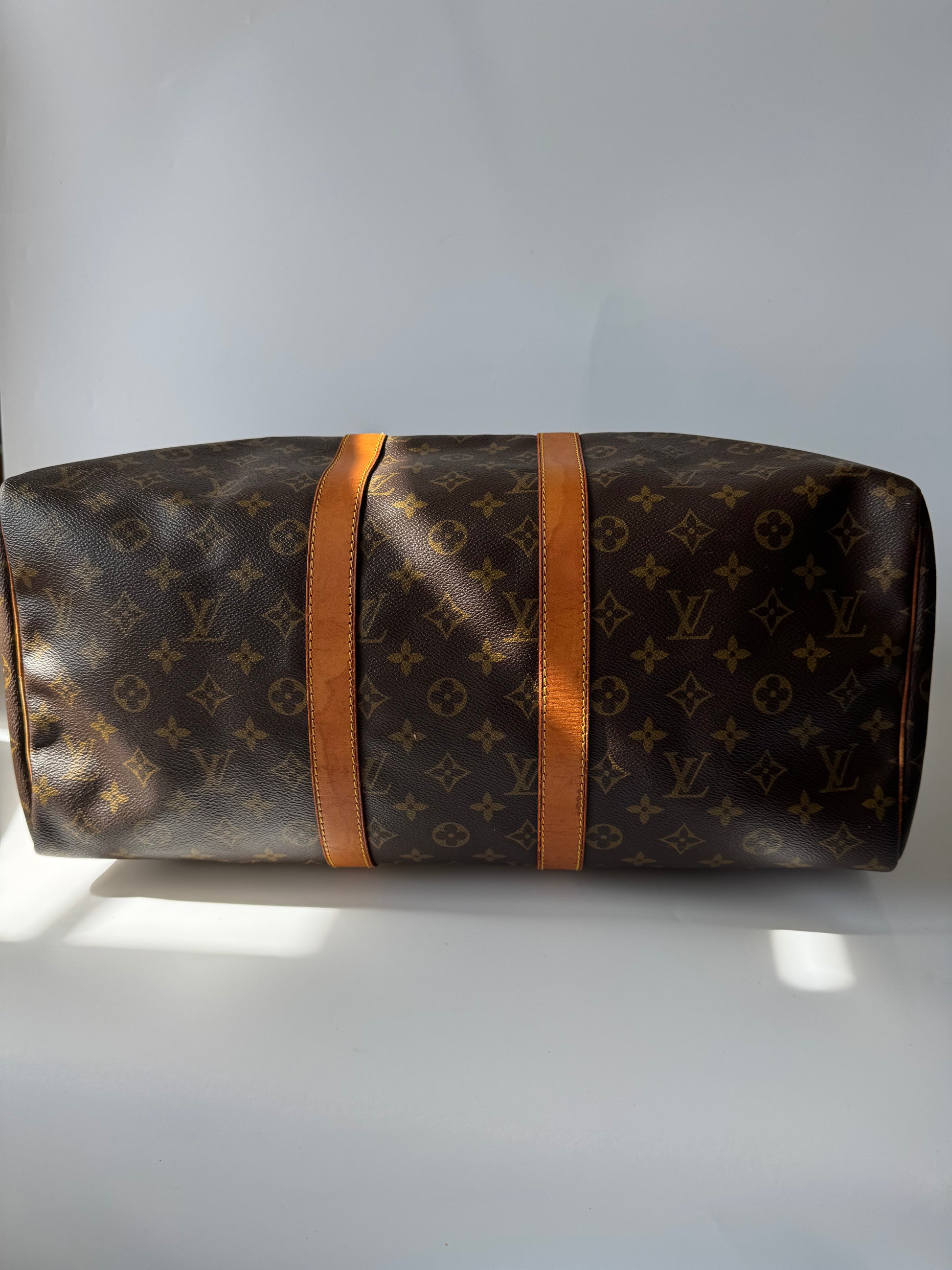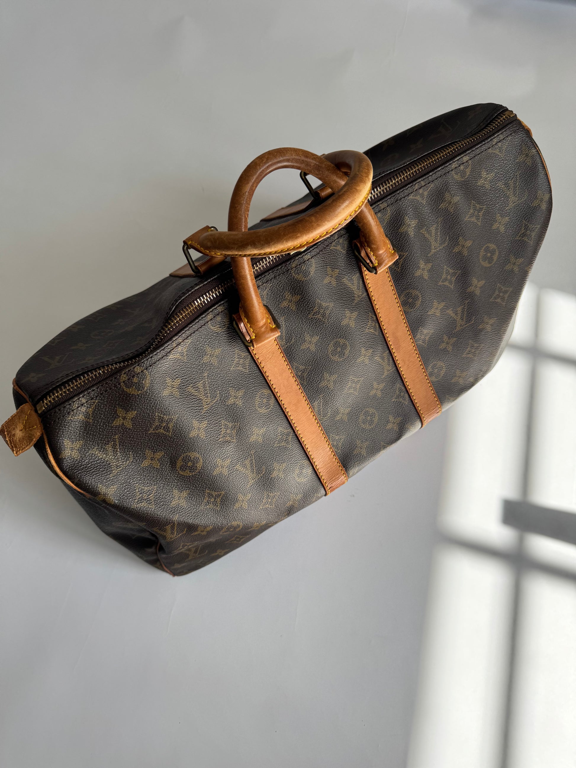 Details: Iconic Louis Vuitton travel bag crafted in classic monogram canvas with natural leather trim. Double zip closure and spacious interior — perfect for weekend trips.