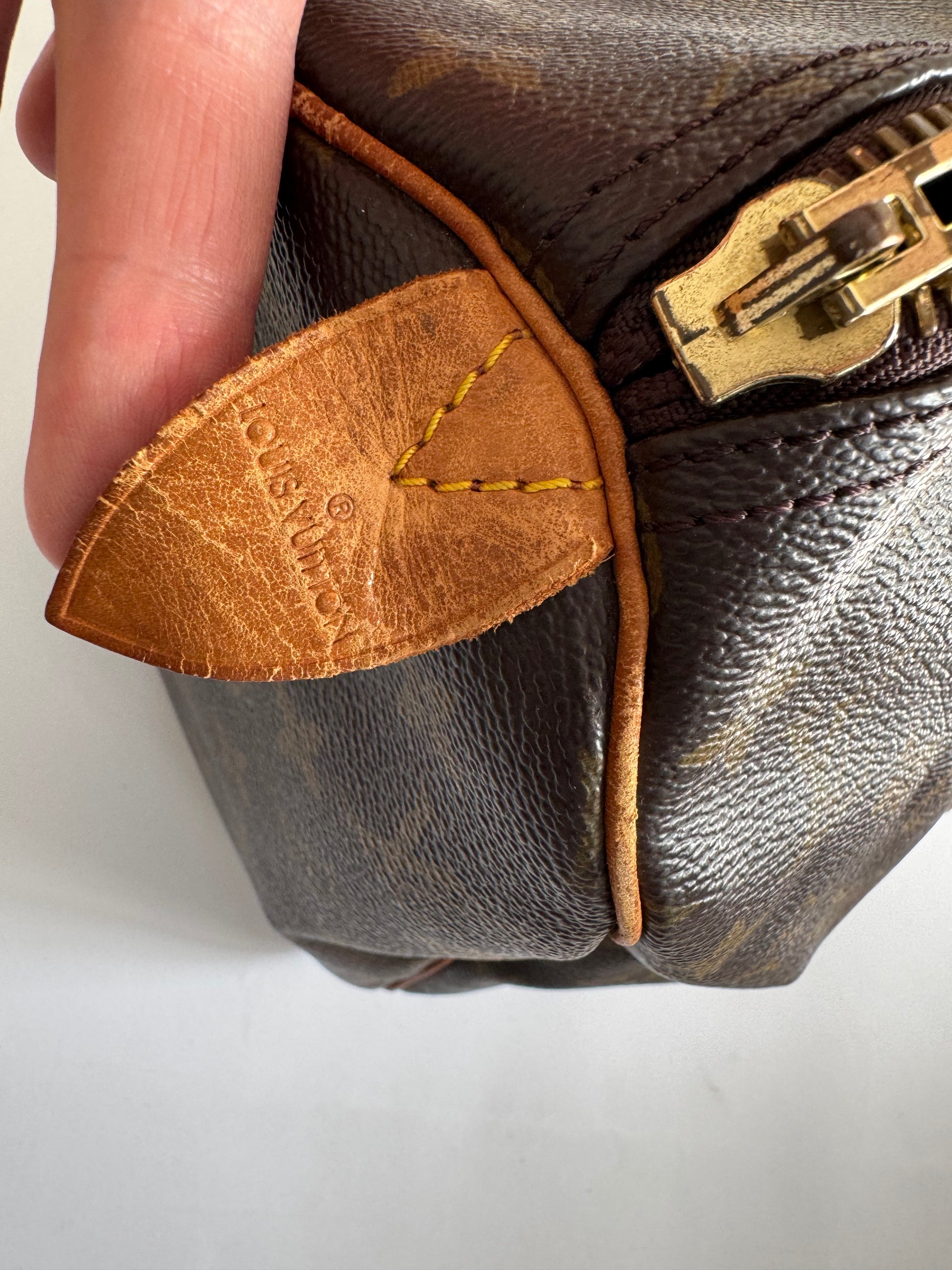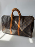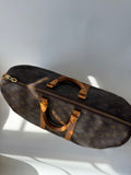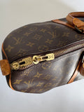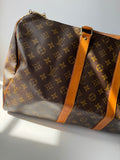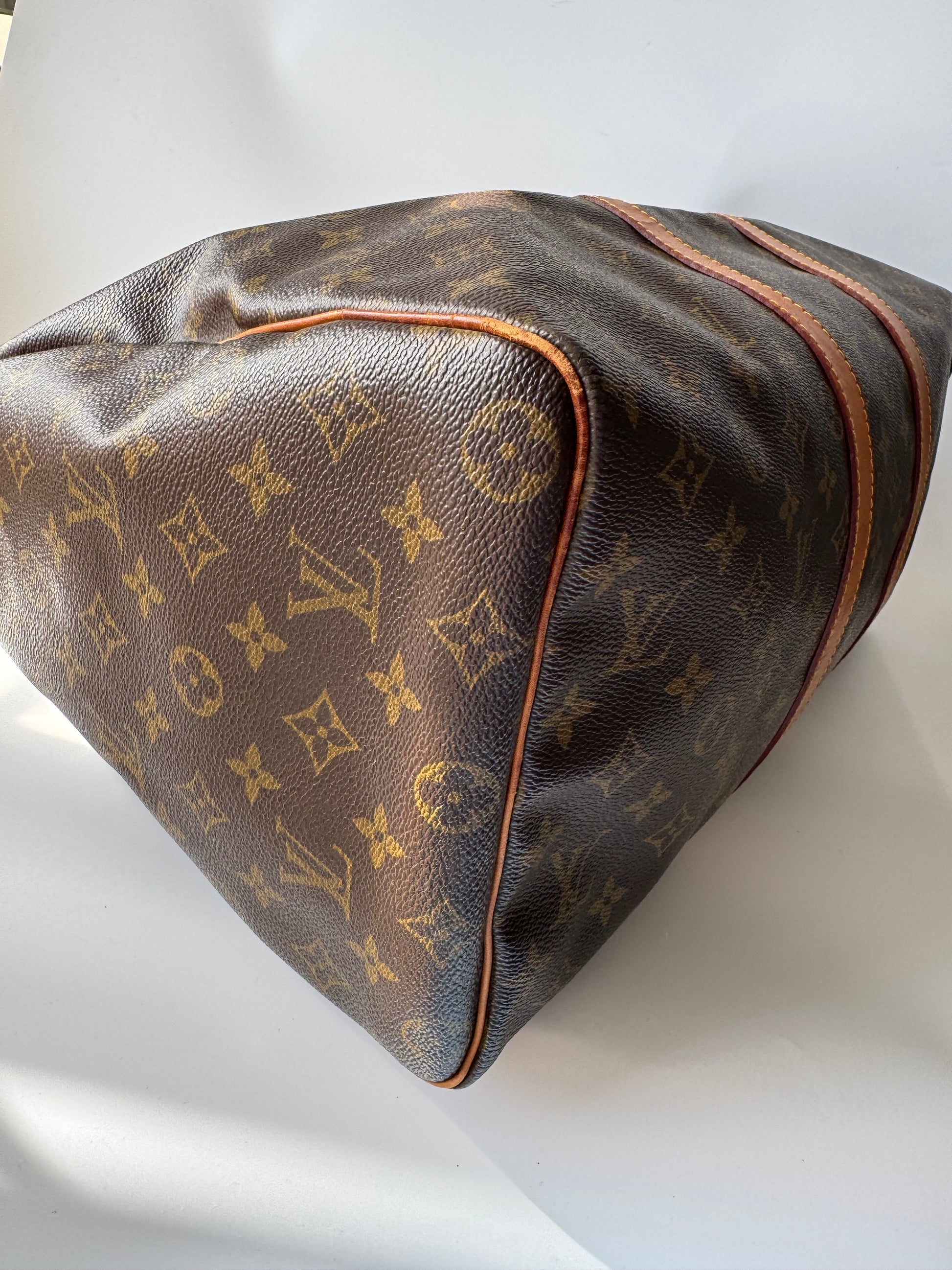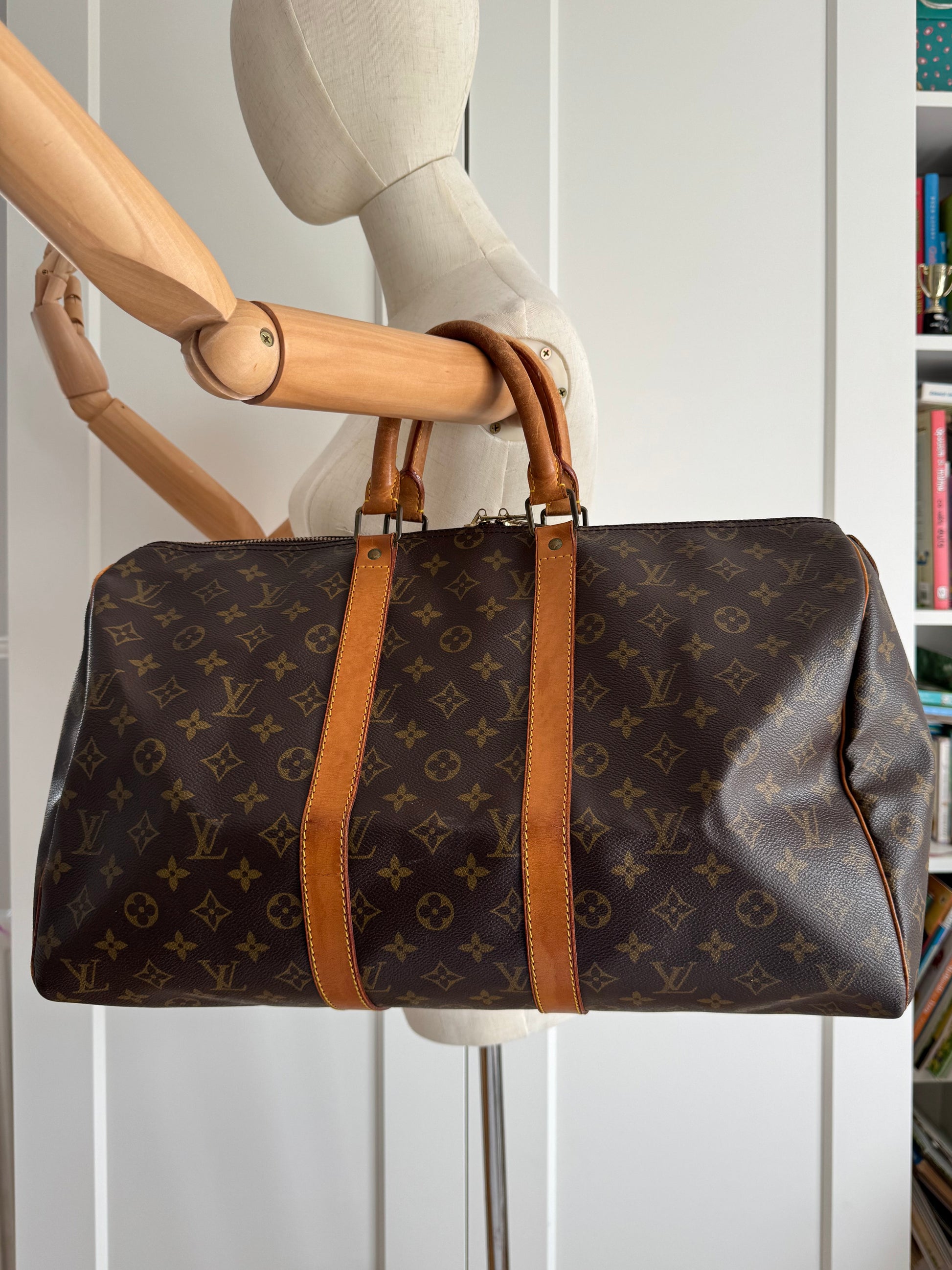 Details: Iconic Louis Vuitton travel bag crafted in classic monogram canvas with natural leather trim. Double zip closure and spacious interior — perfect for weekend trips.
