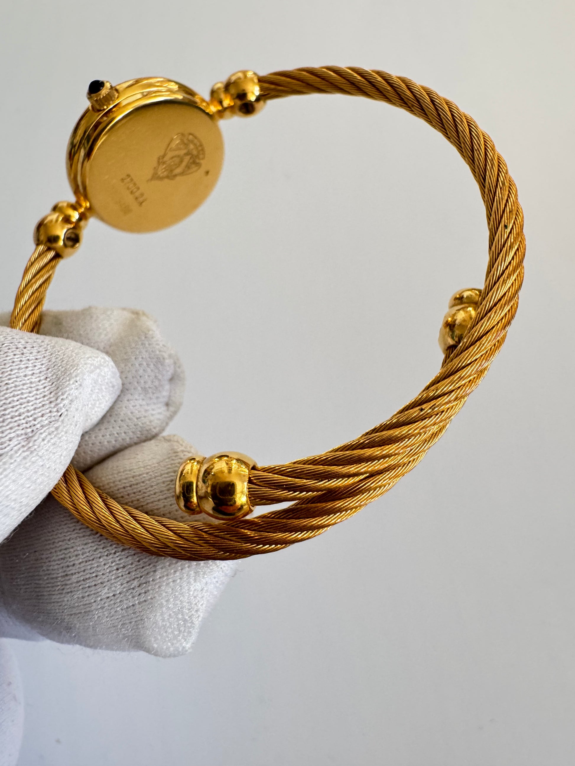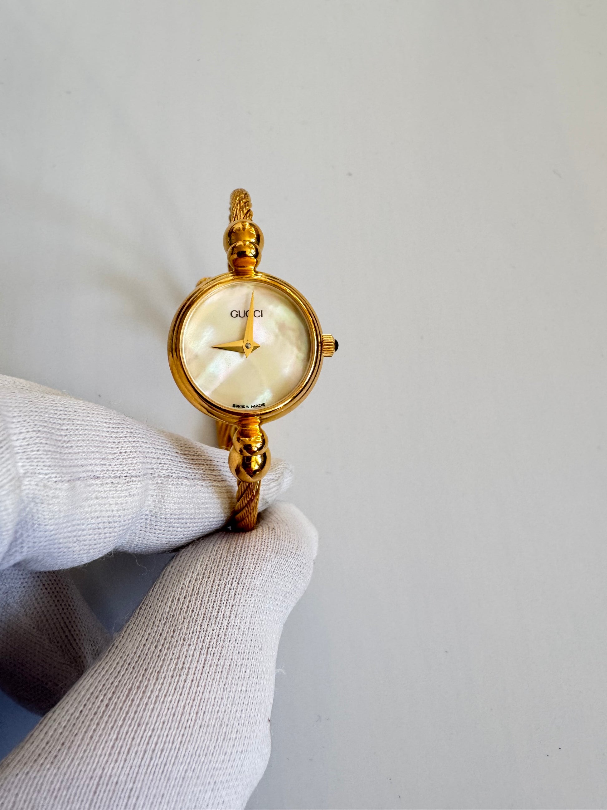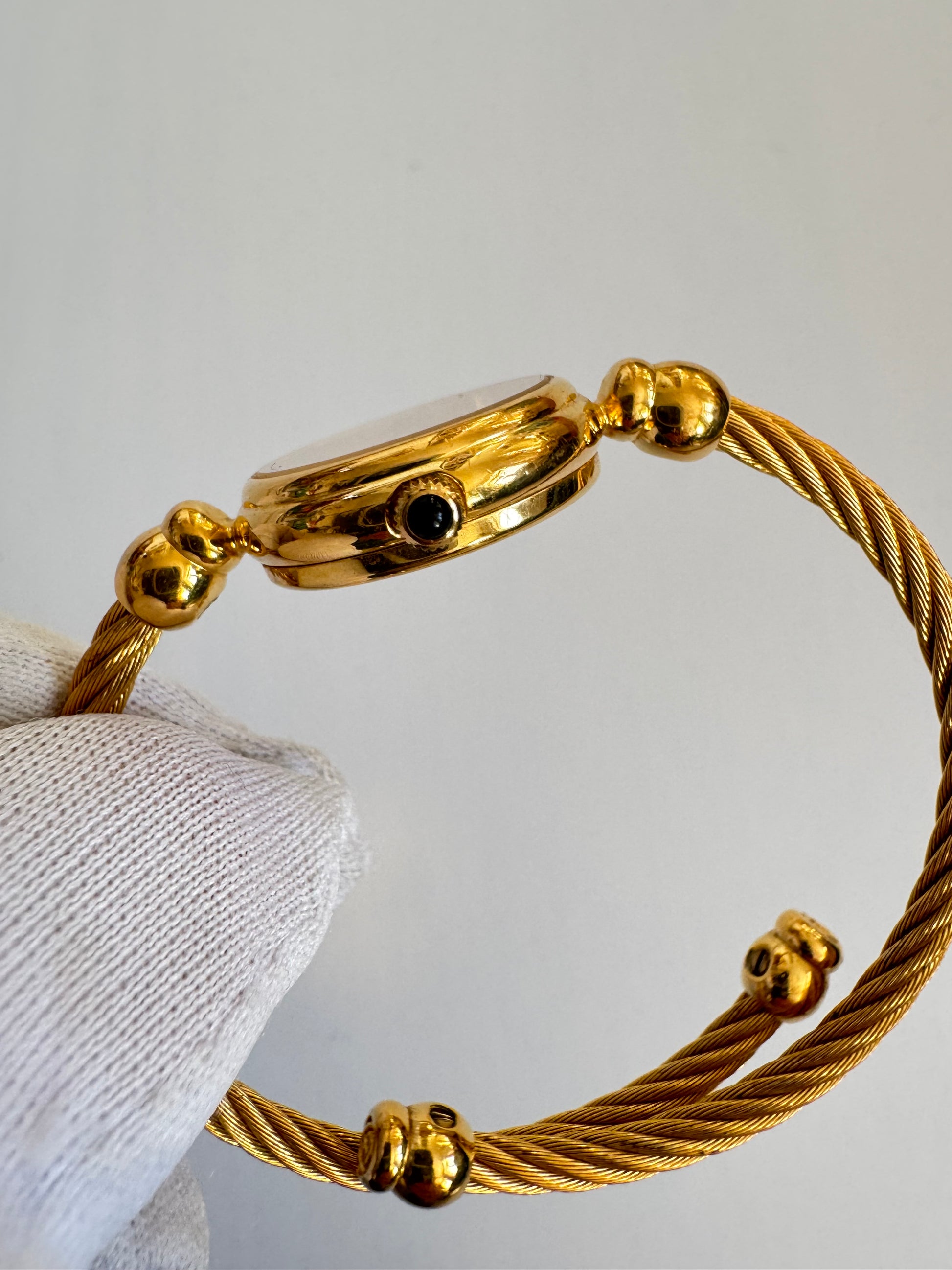Details: Delicate gold-tone bracelet watch with a minimalist mother-of-pearl dial and flexible bangle design. Subtle, feminine and timeless — a beautiful everyday piece with a refined vintage feel.