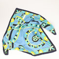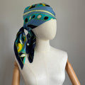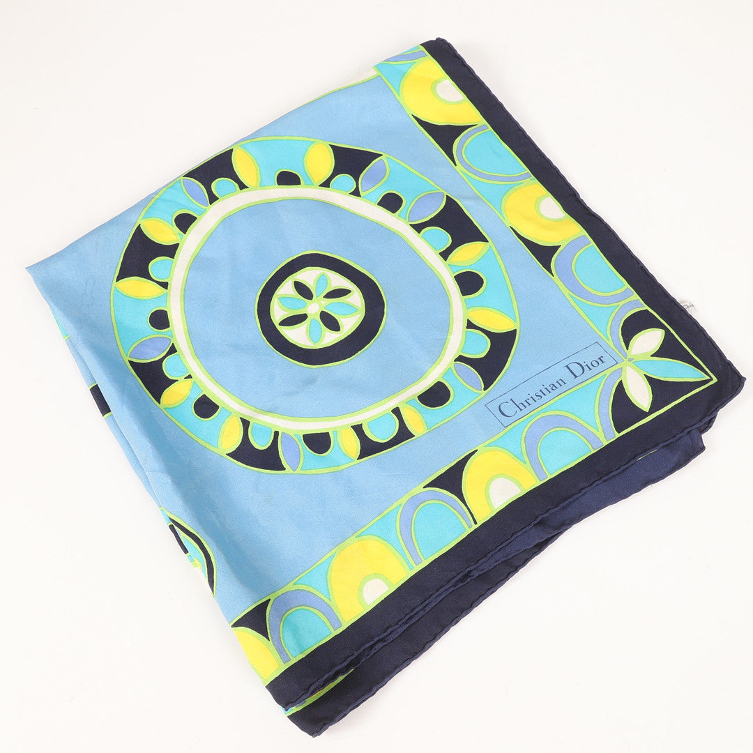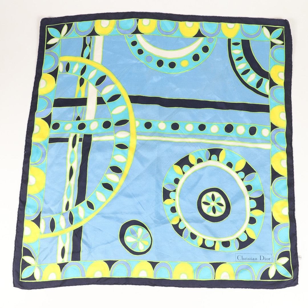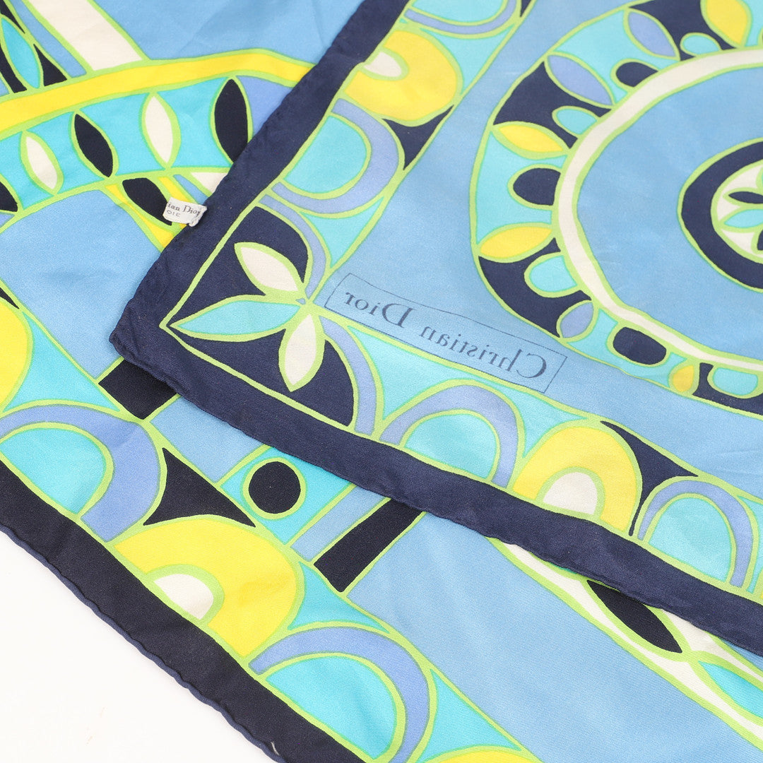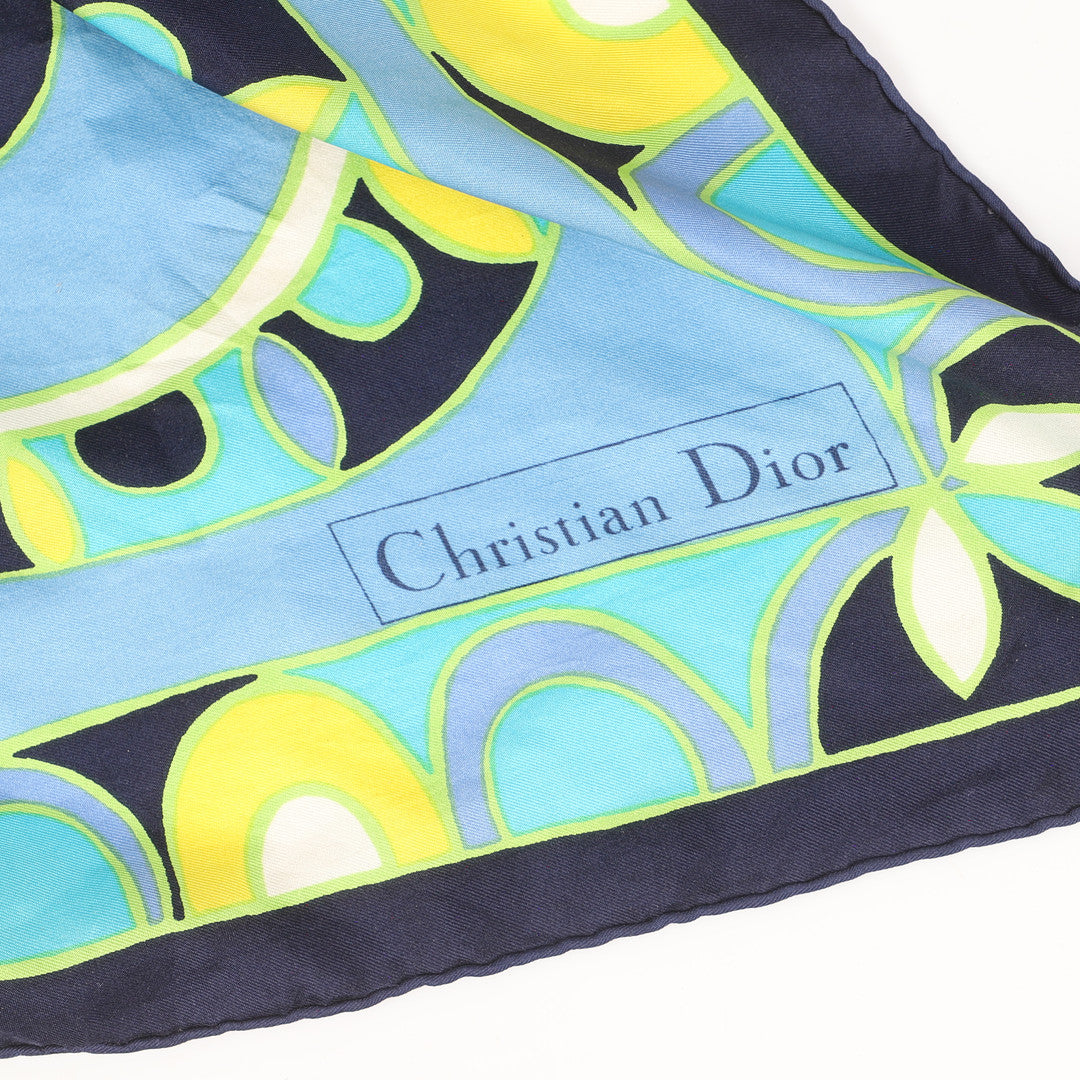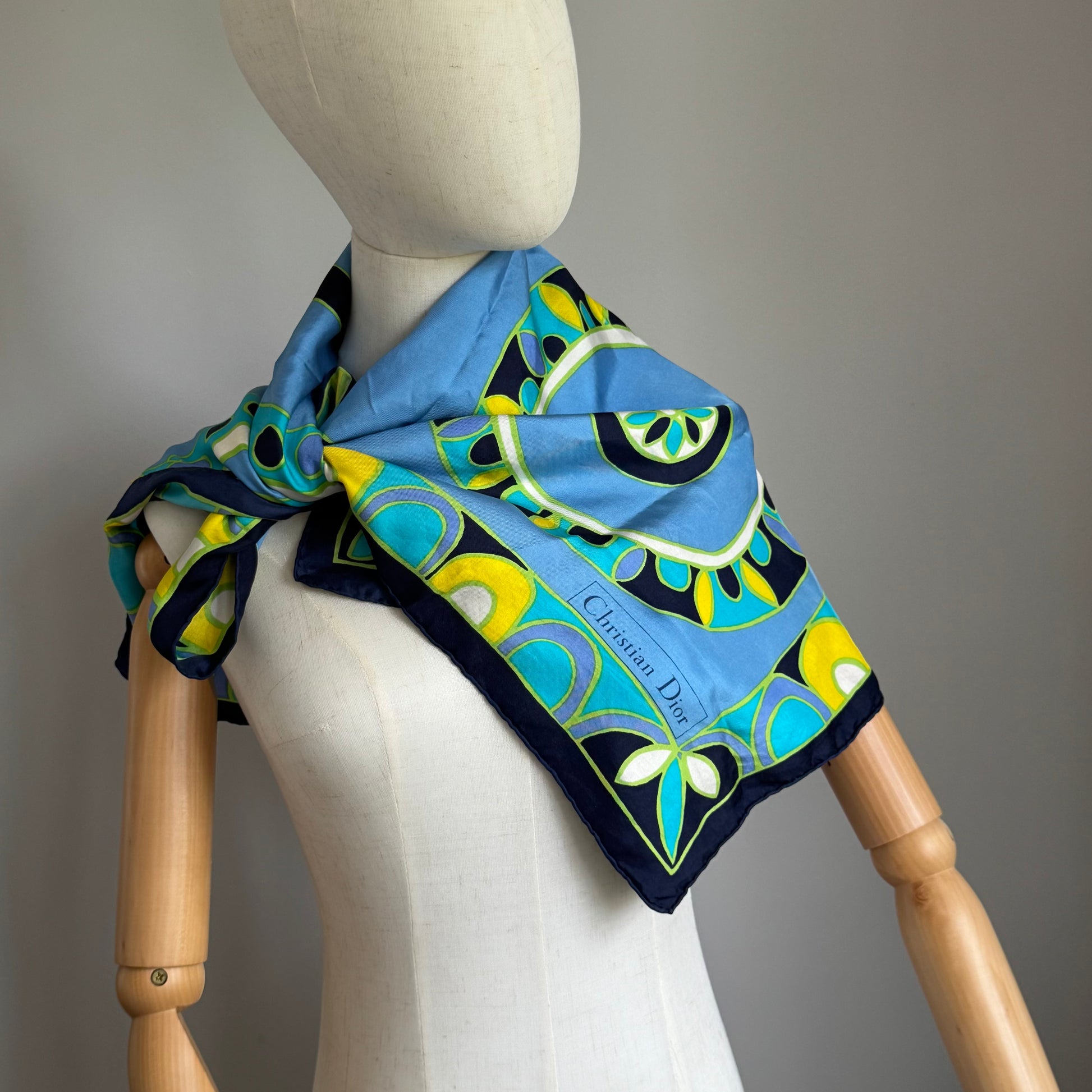 Vibrant geometric print in sky blue, lime and yellow framed by a bold navy border, discreetly signed “Christian Dior.” Lightweight square in pure silk — an instant pop of colour with Parisian heritage flair.
