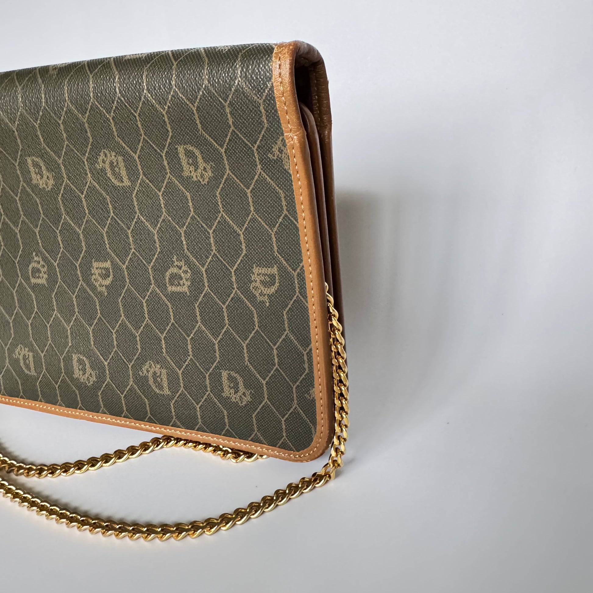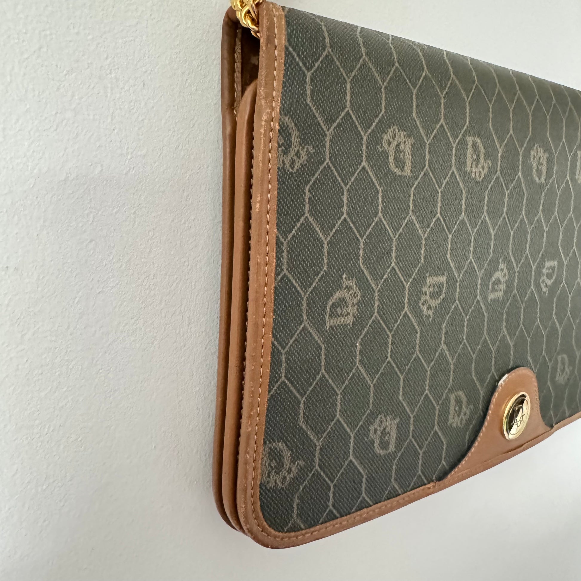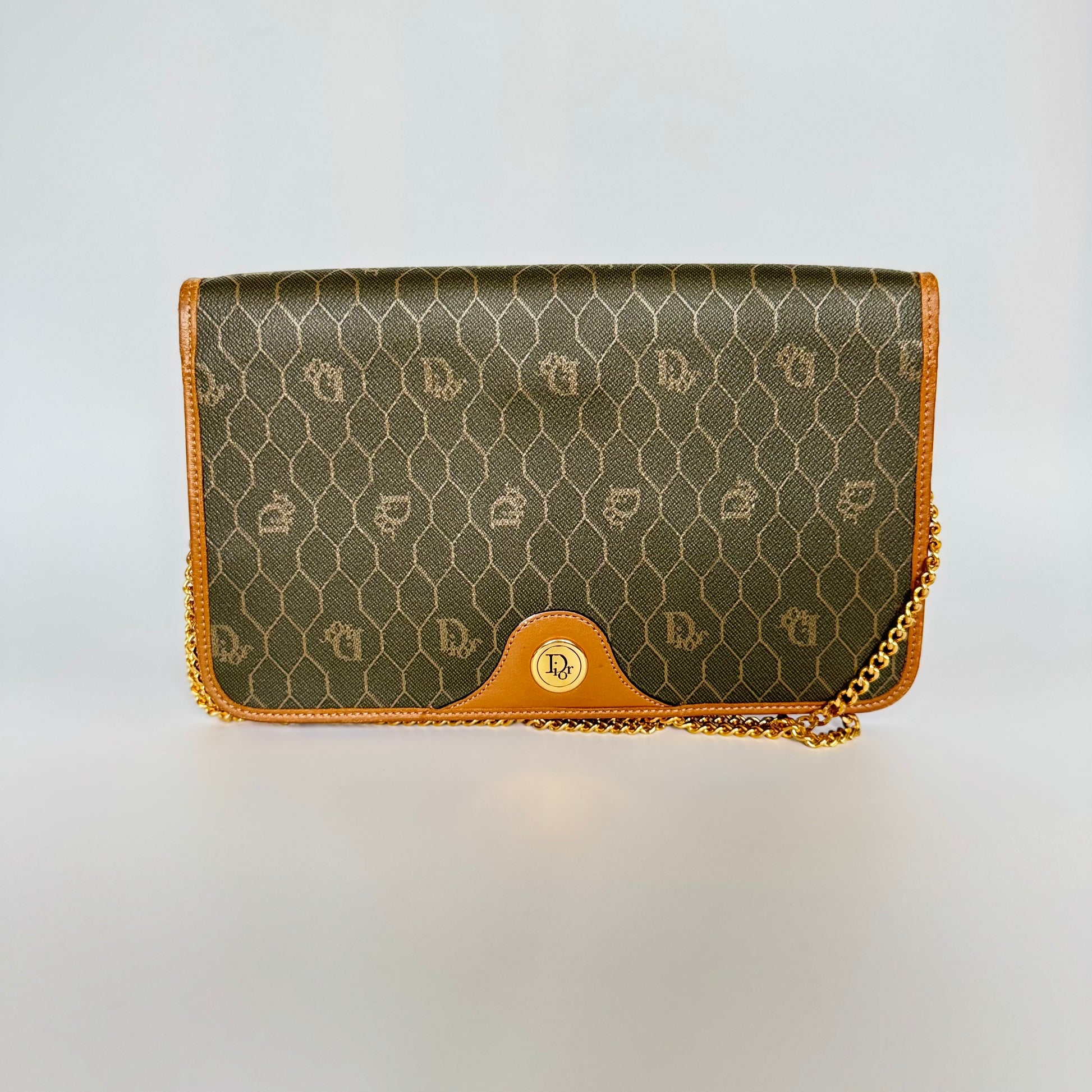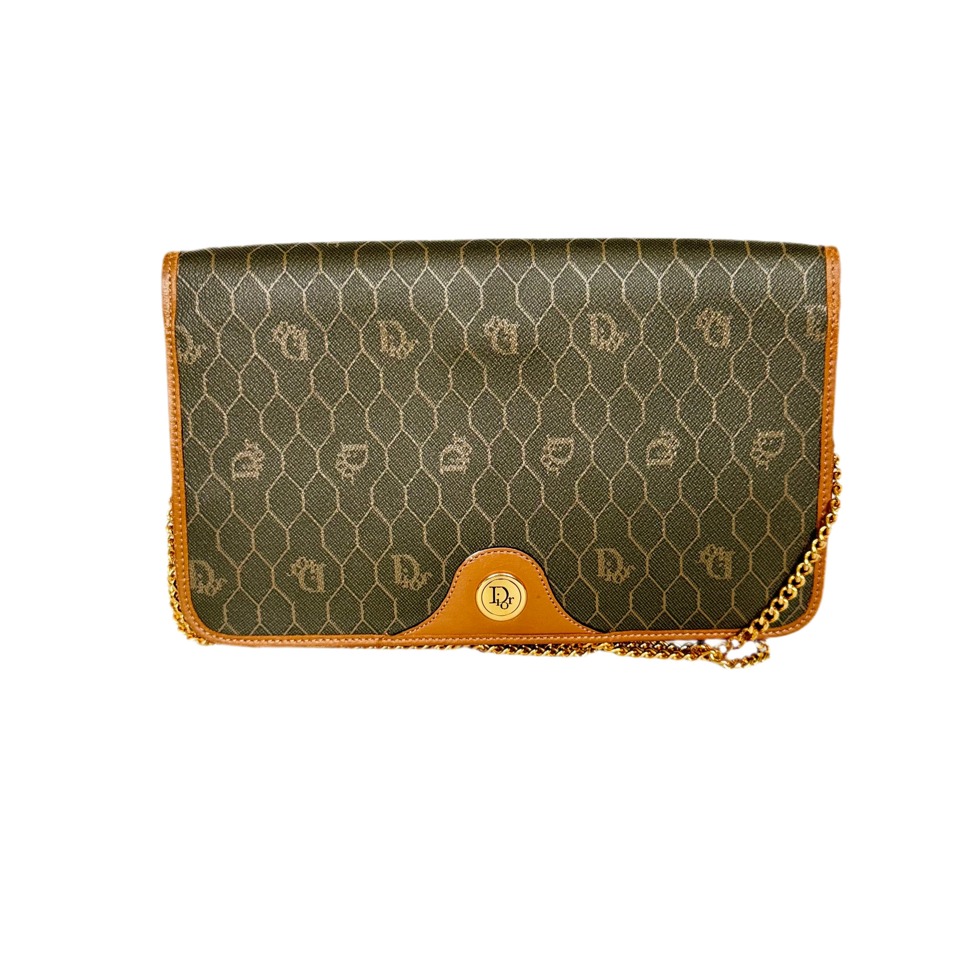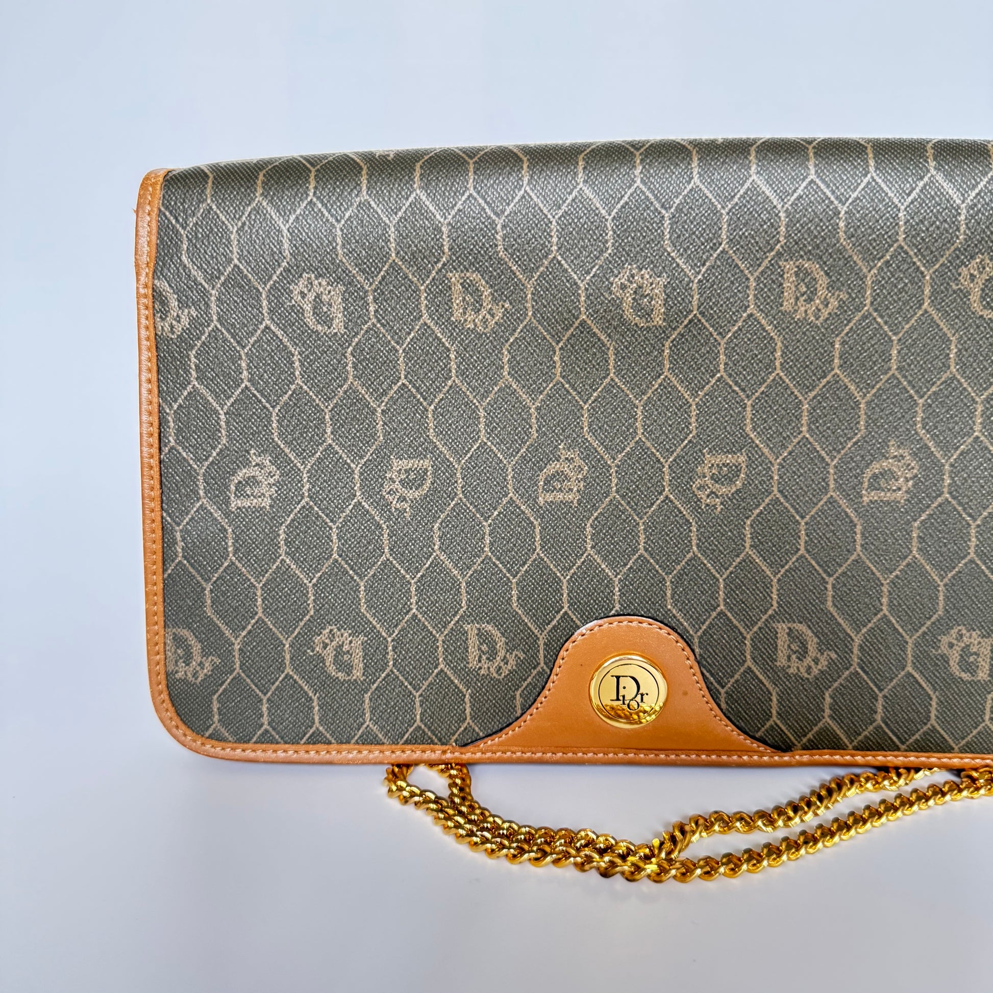Signature honeycomb monogram canvas with tan leather trim, a structured flap, and gold-tone CD snap — wear as a clutch or crossbody with the removable chain. Elegant neutrals for day-to-night.