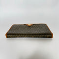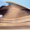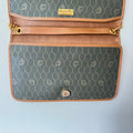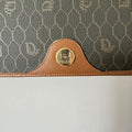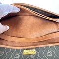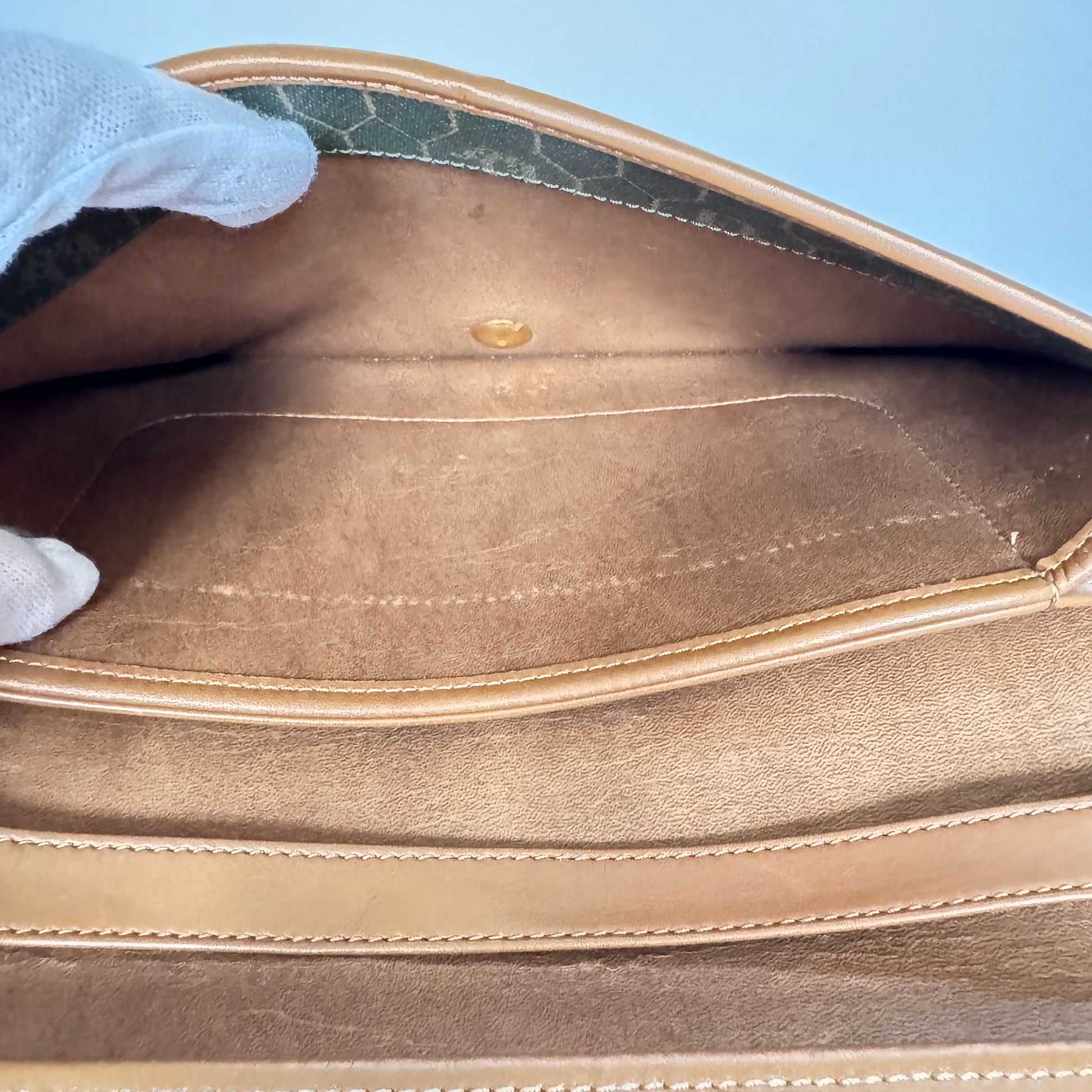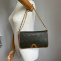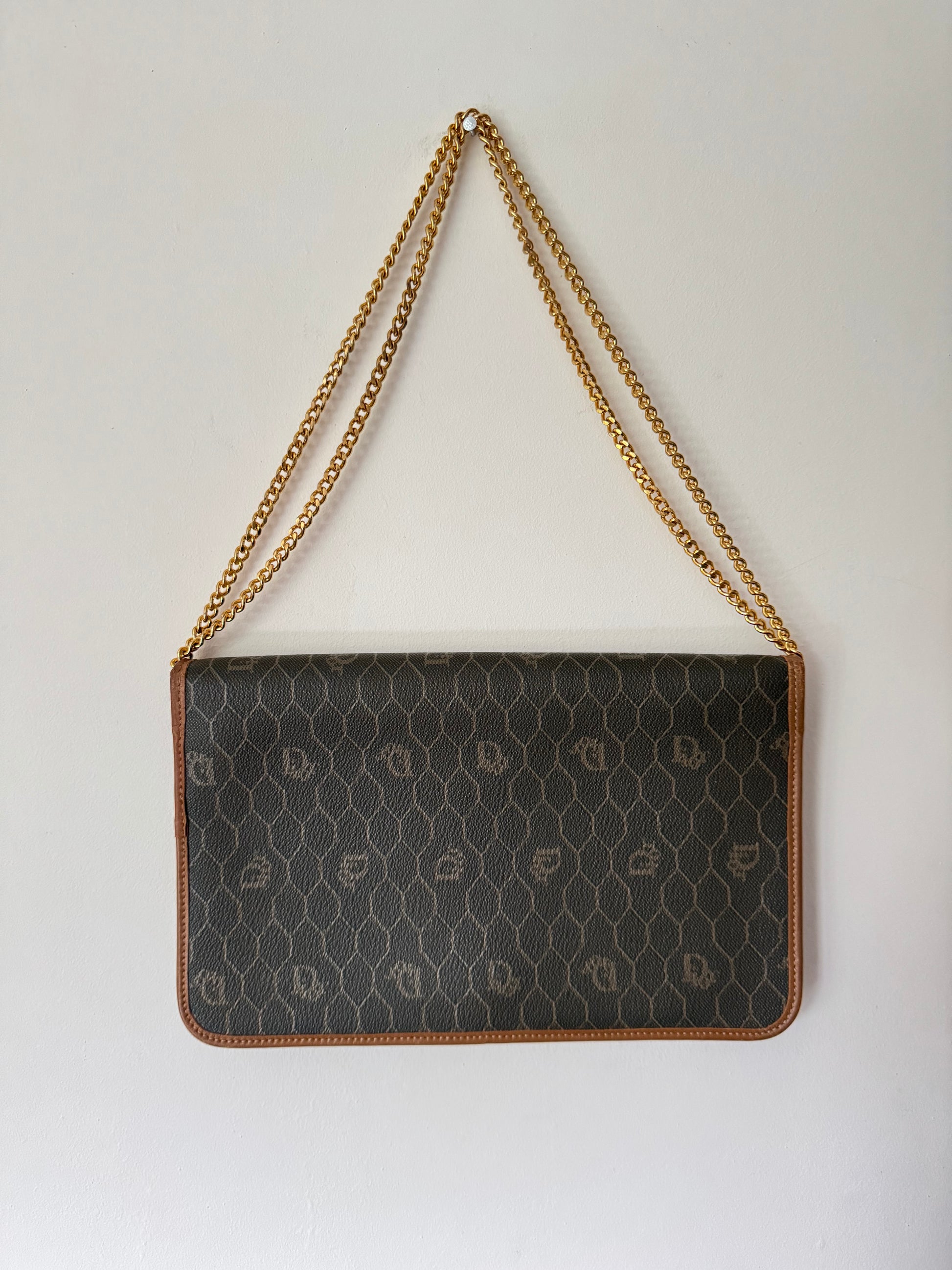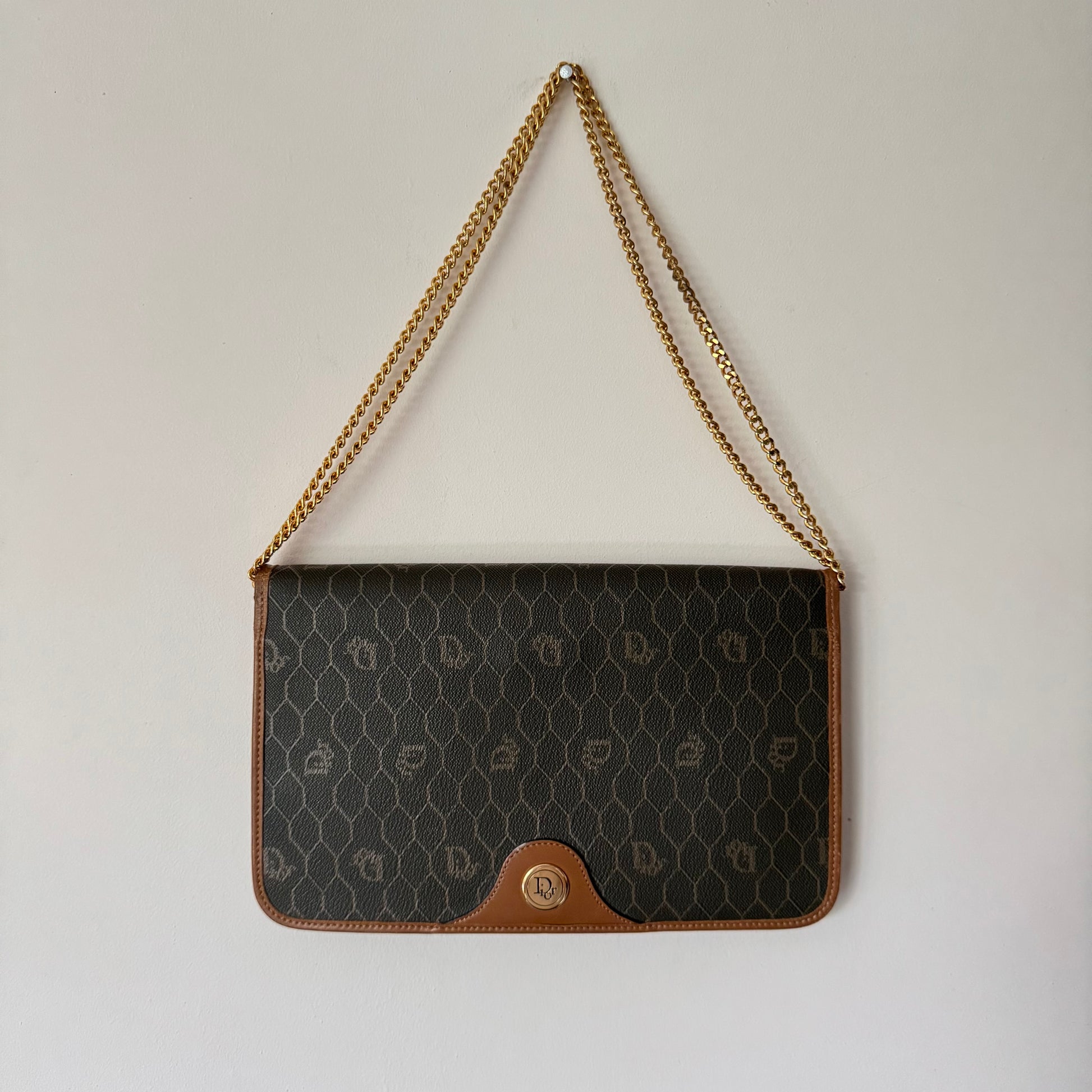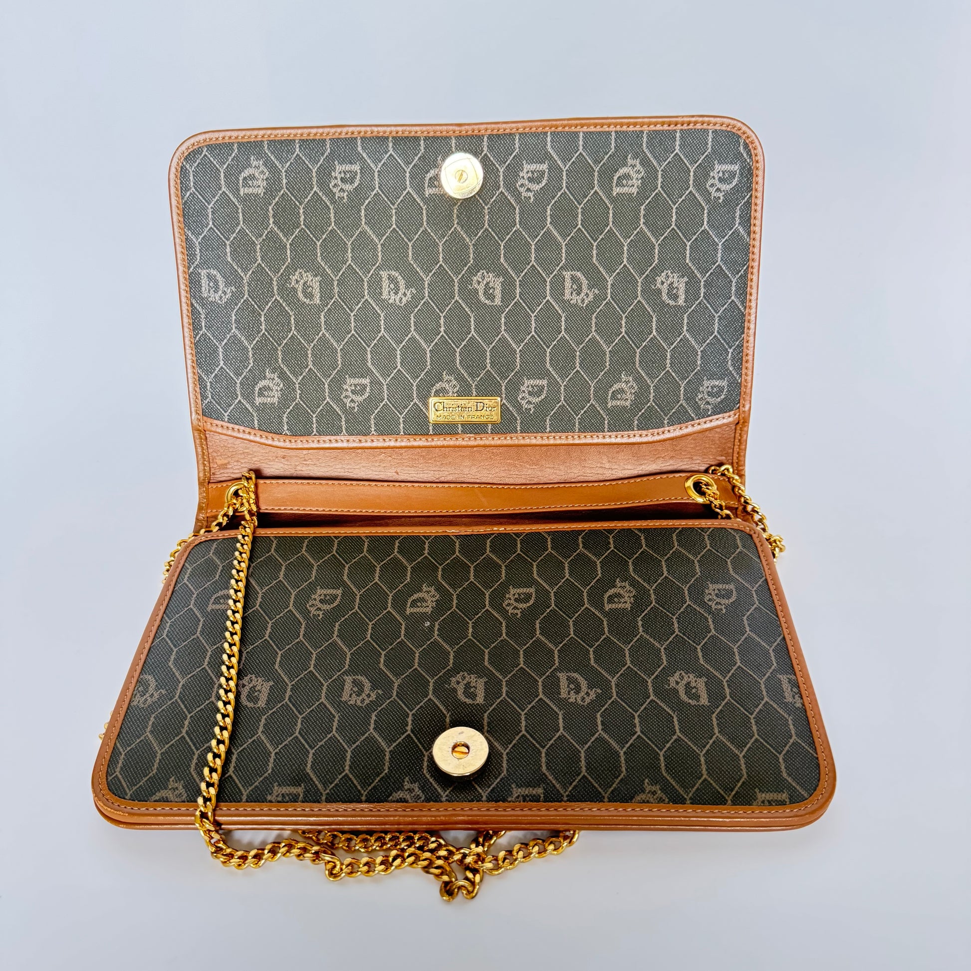 Signature honeycomb monogram canvas with tan leather trim, a structured flap, and gold-tone CD snap — wear as a clutch or crossbody with the removable chain. Elegant neutrals for day-to-night.