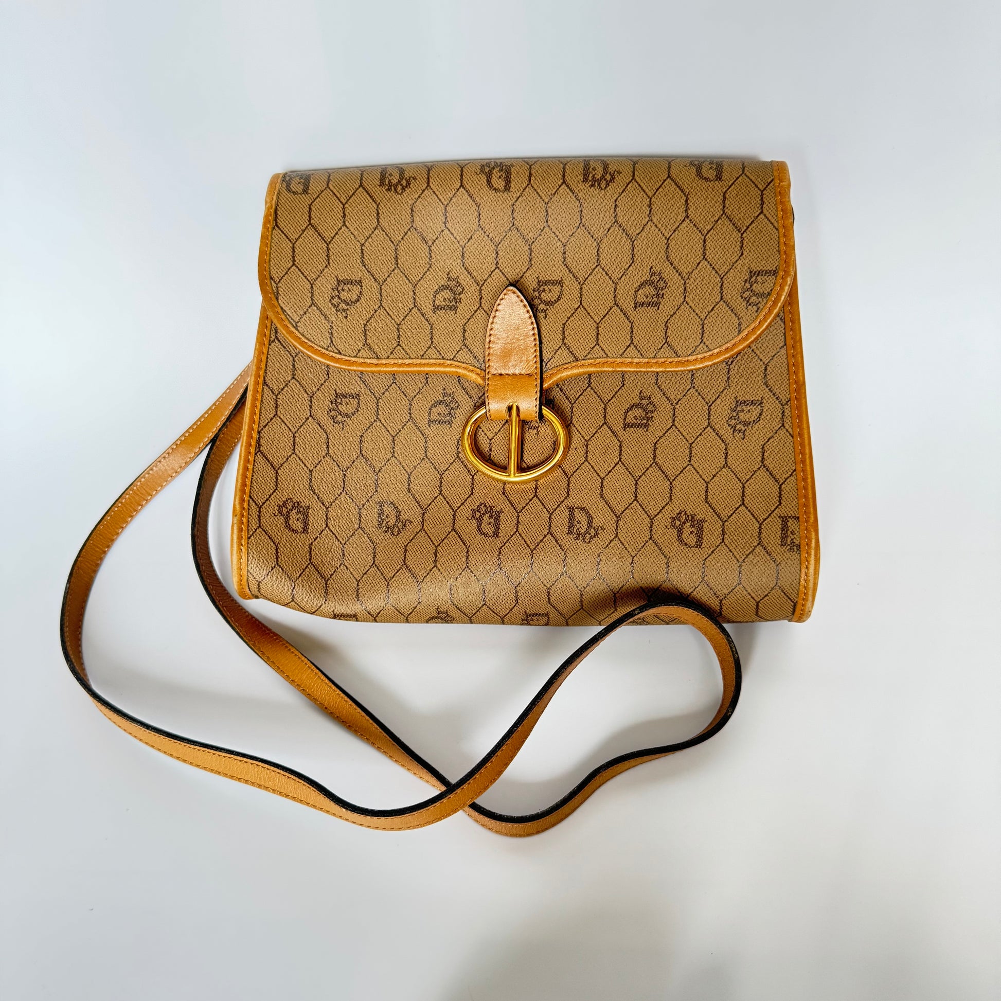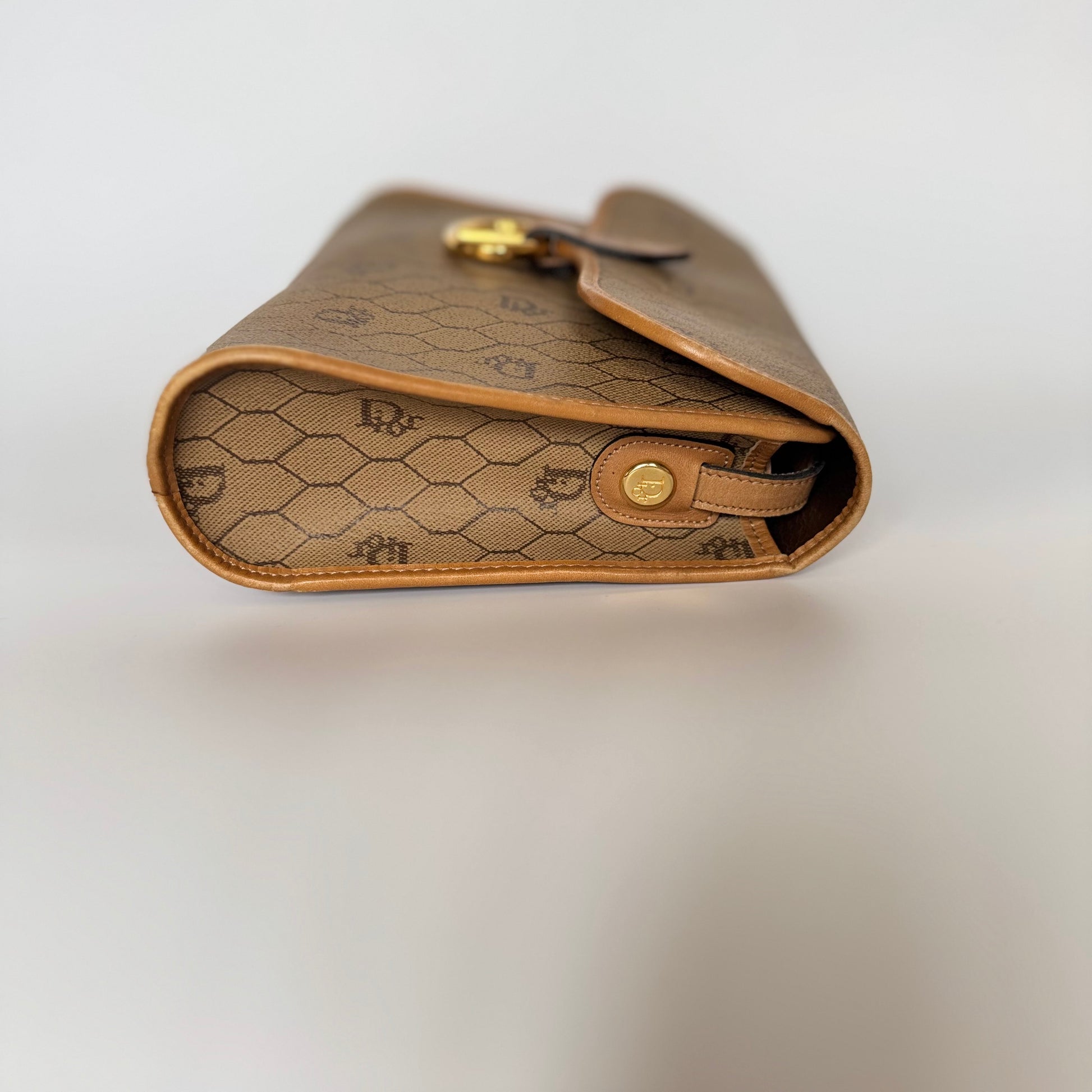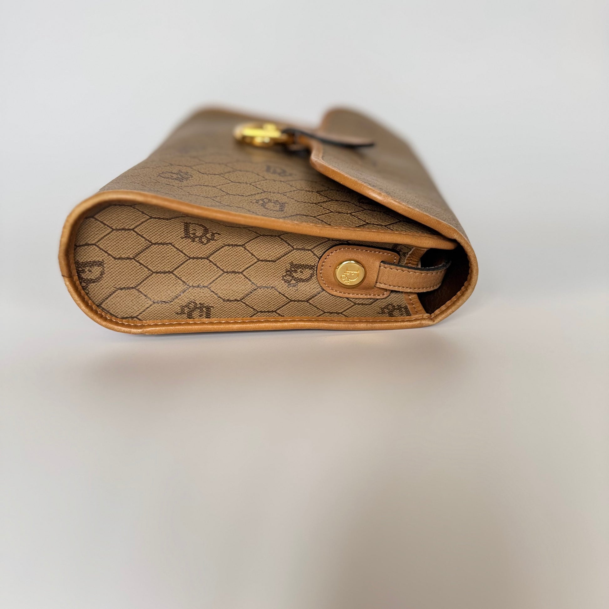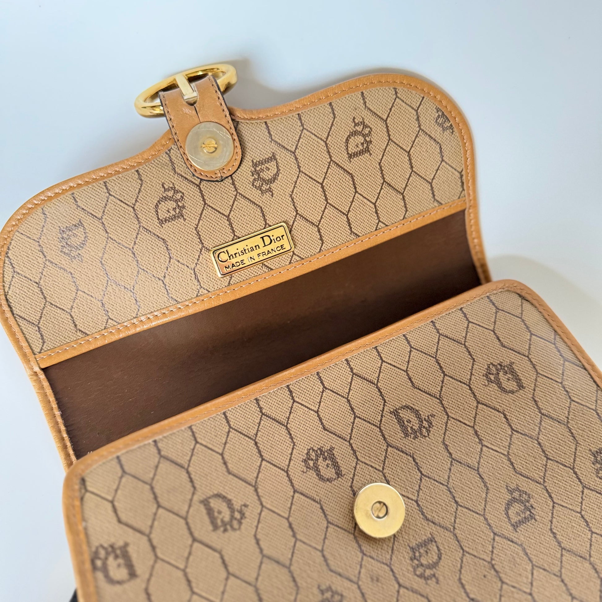 Signature honeycomb monogram canvas in camel tones with matching leather trim and a structured flap finished with a gold-tone CD buckle — elegant, understated, and highly collectible.