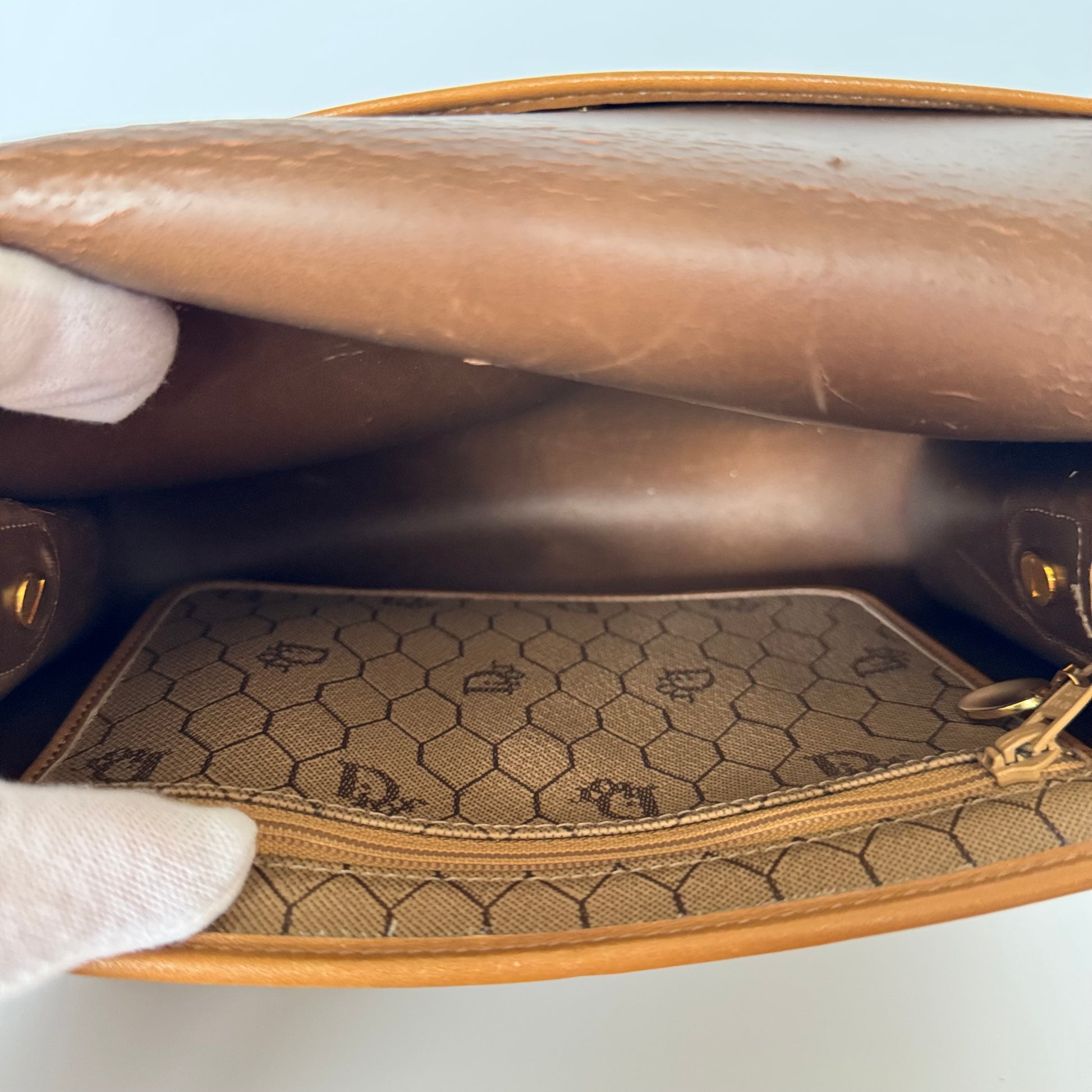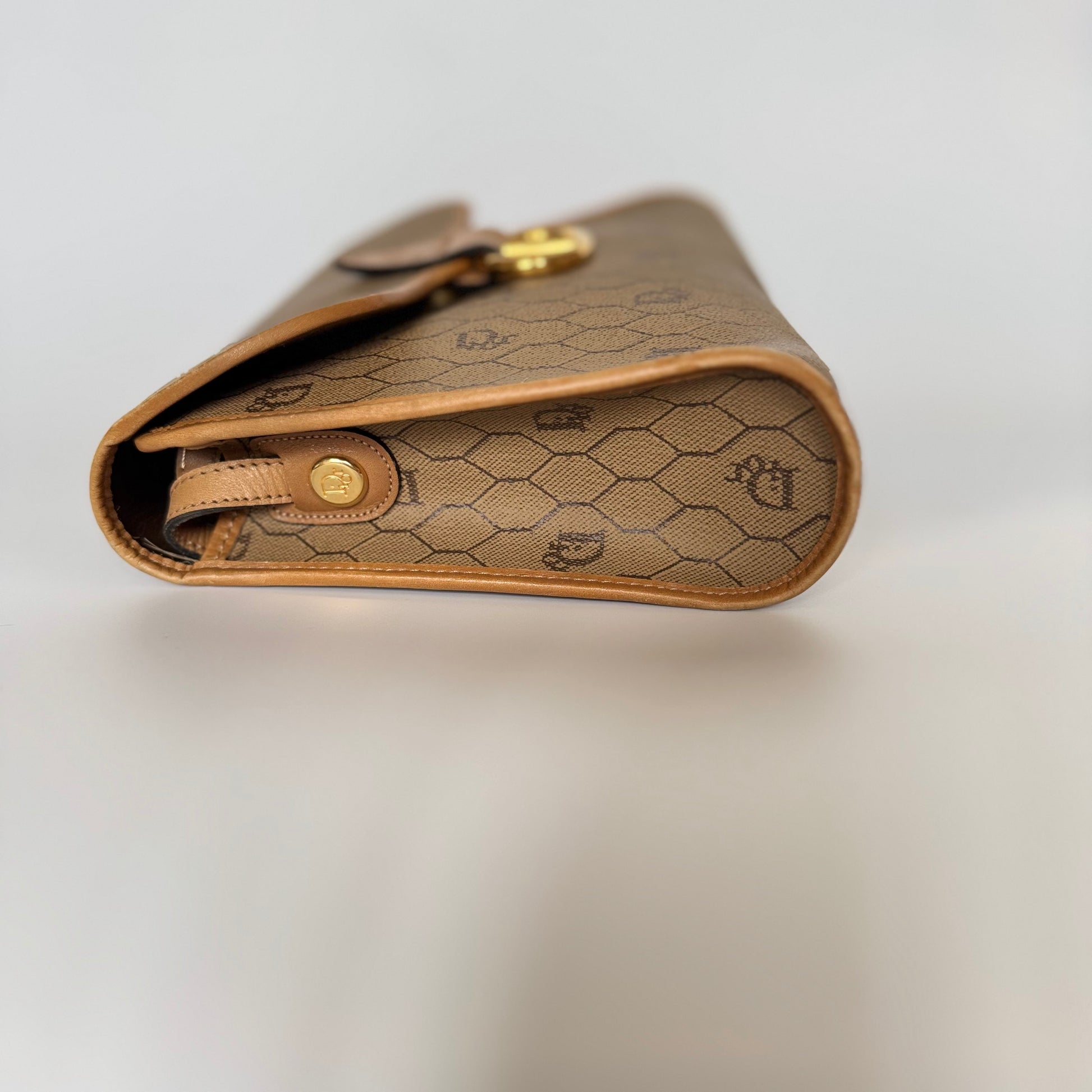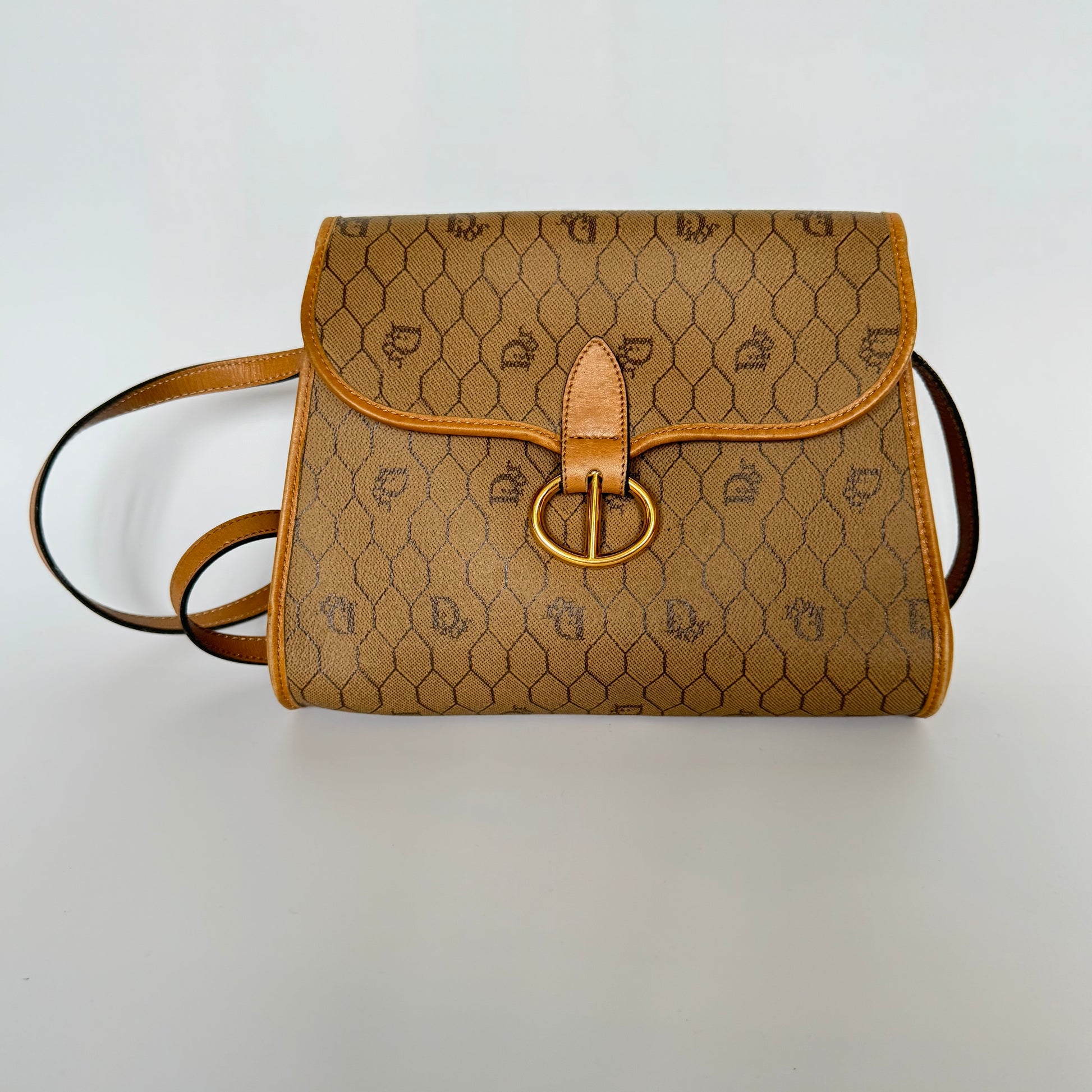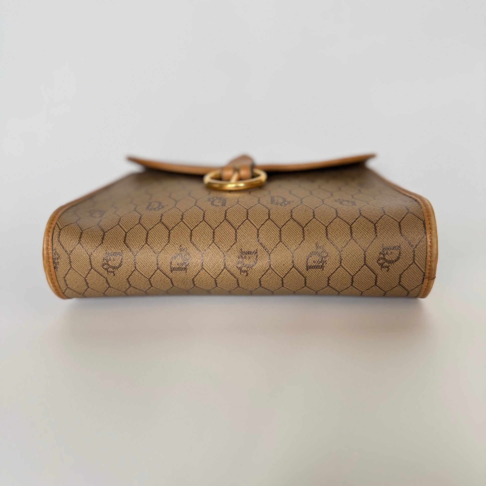 Signature honeycomb monogram canvas in camel tones with matching leather trim and a structured flap finished with a gold-tone CD buckle — elegant, understated, and highly collectible.