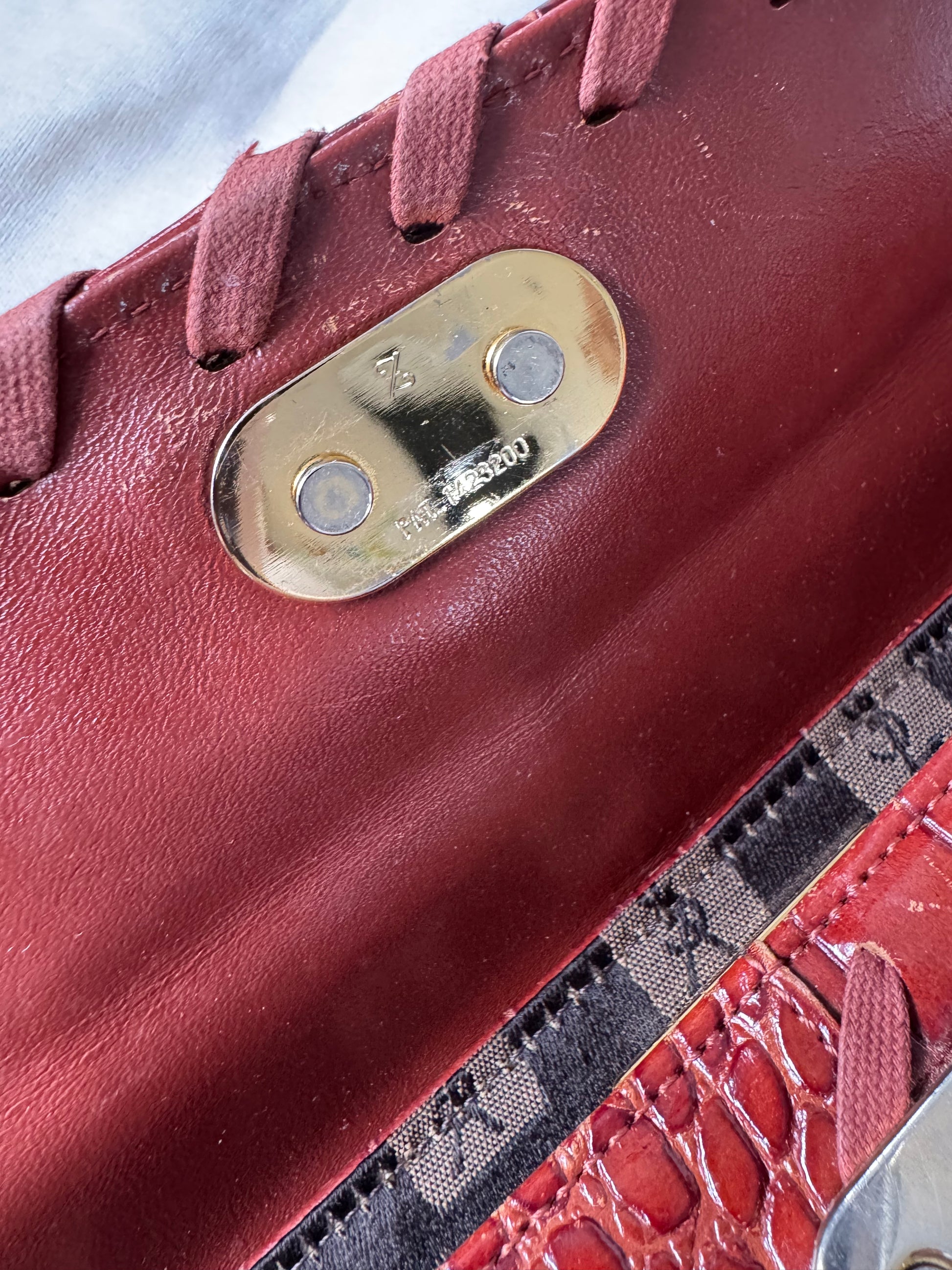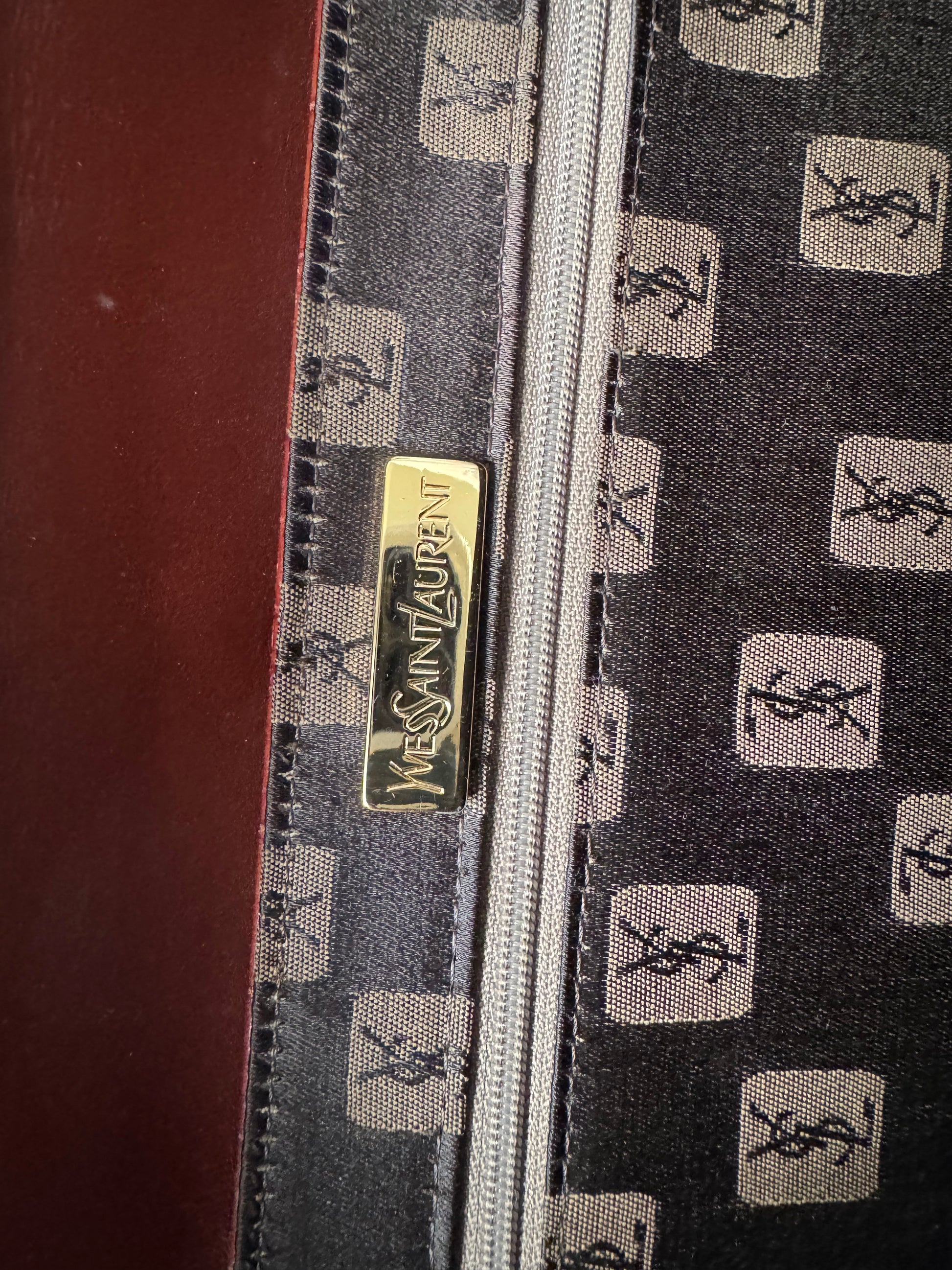 Glossy burgundy croc-embossed leather with whipstitch accents and a bold gold-tone YSL charm — a collectible YSL piece that balances vintage glamour with everyday practicality.