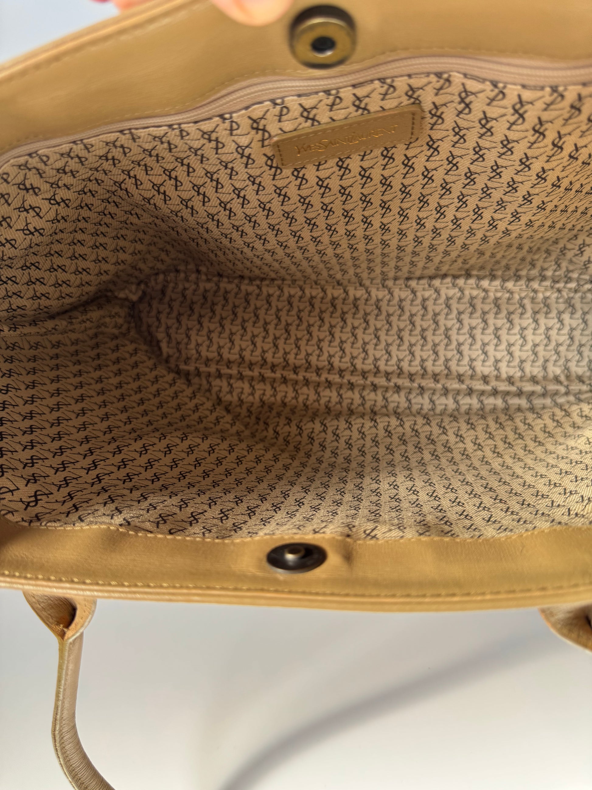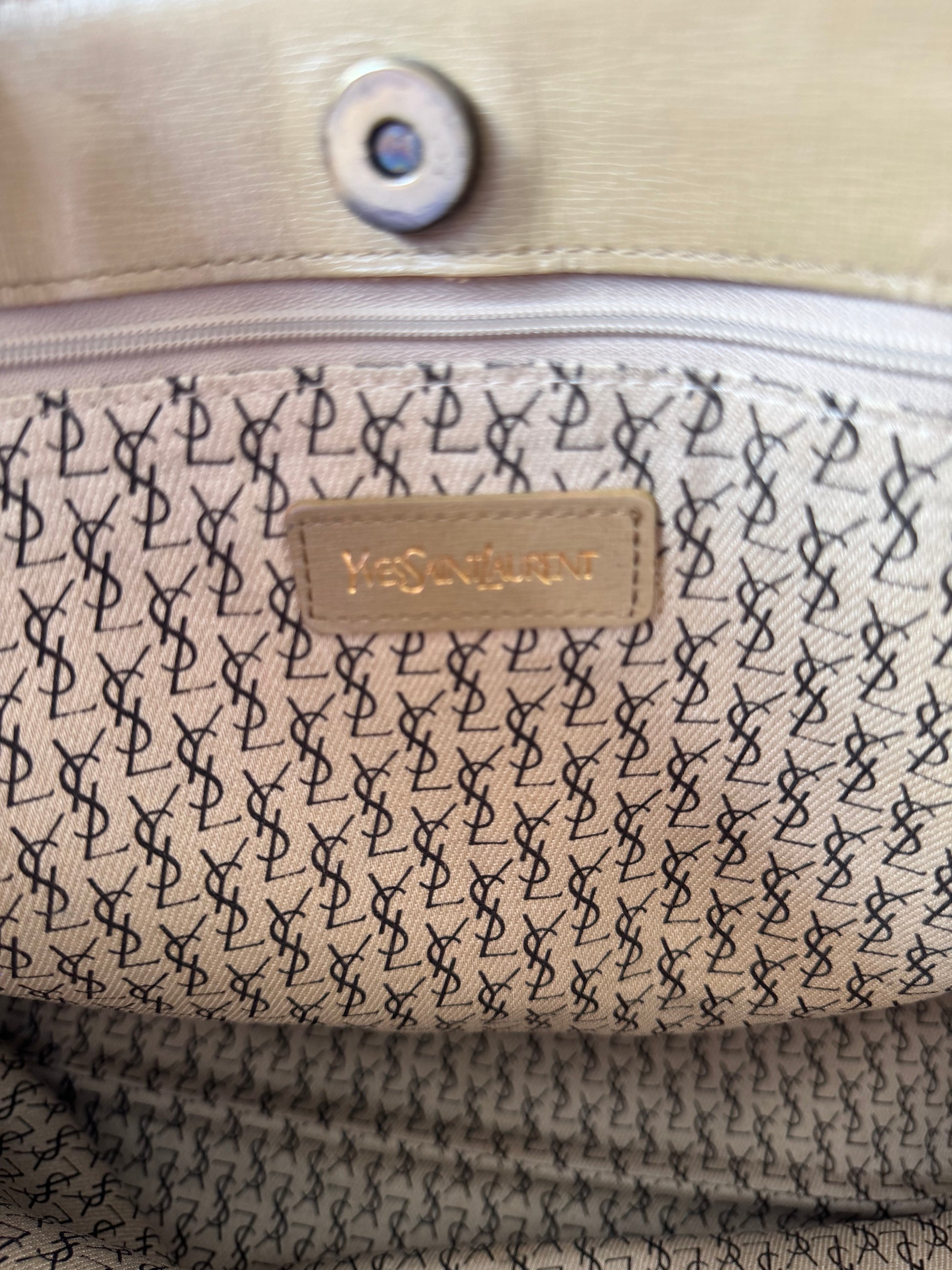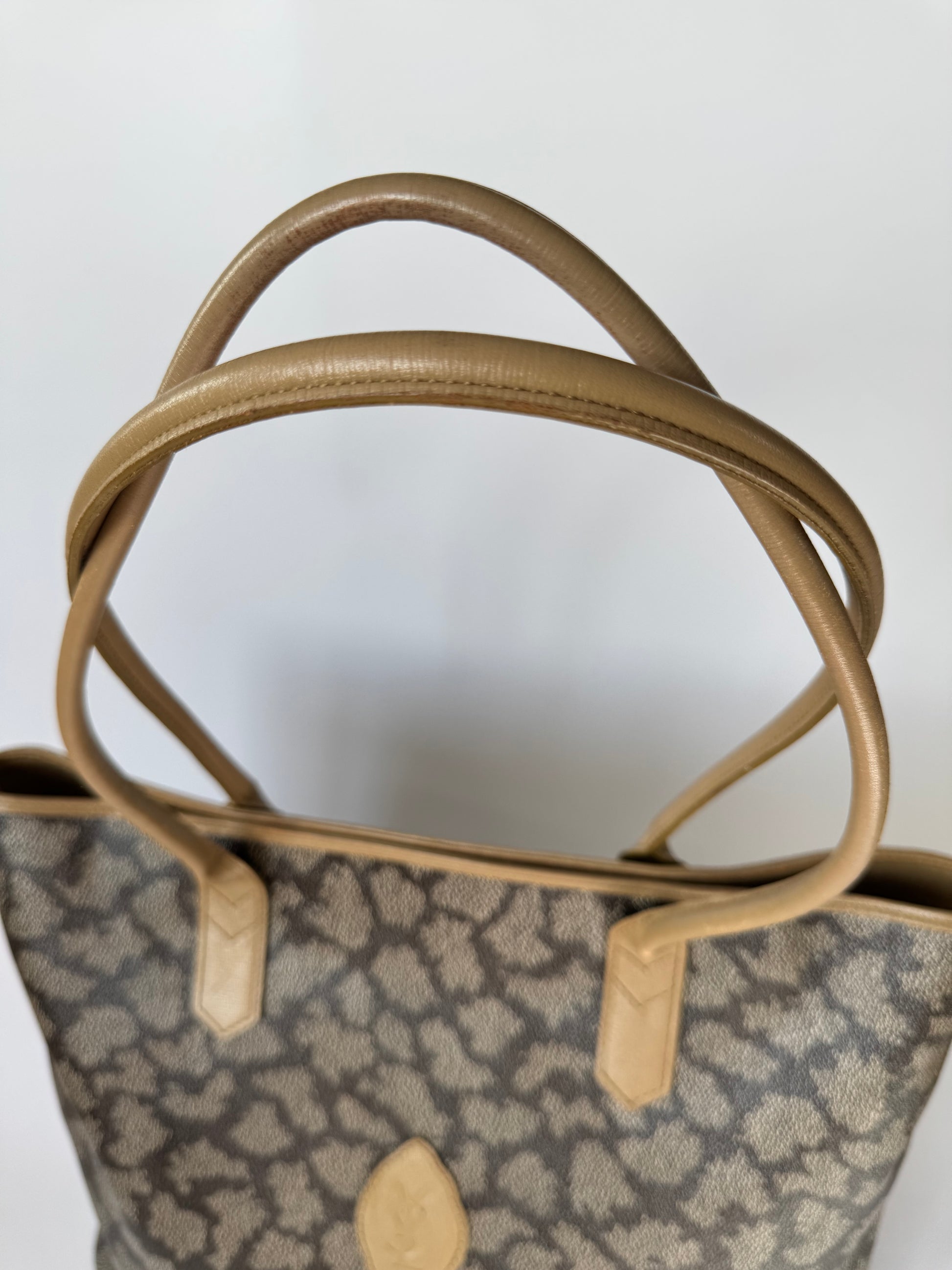 Expertly crafted from brown and beige giraffe-print PVC leather with matching leather trim, this YSL tote embodies the brand’s bold early-2000s aesthetic.